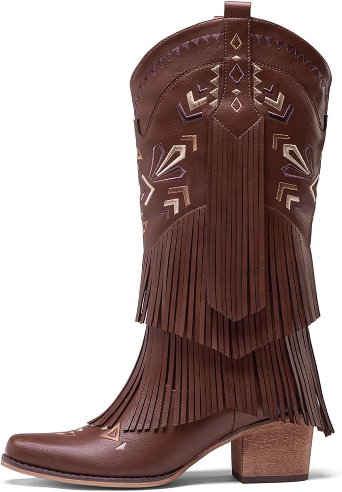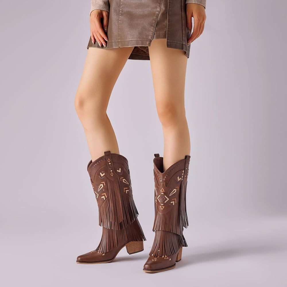 Cowboy Boots for Women Fringe Embroidered Knee High Western Cowgirl Boots Pointed Toe Chunky Heels