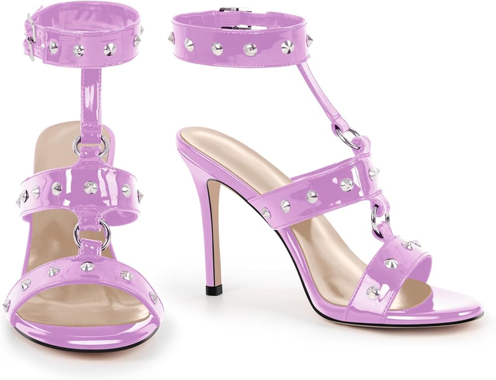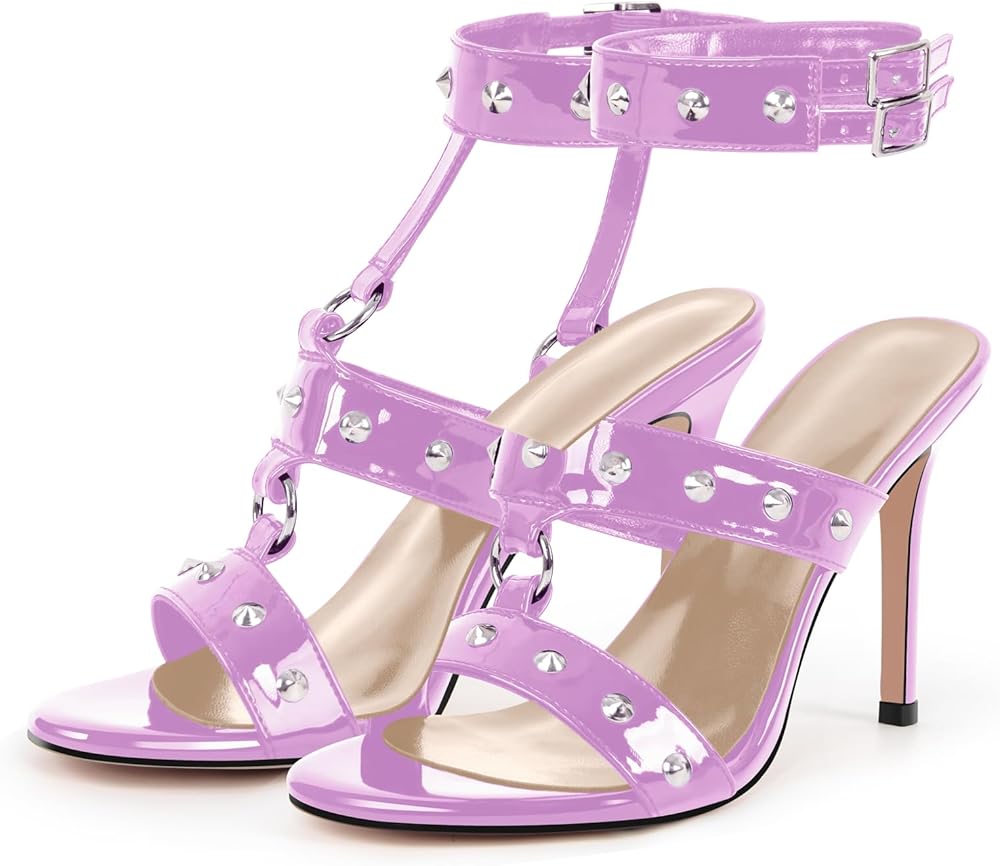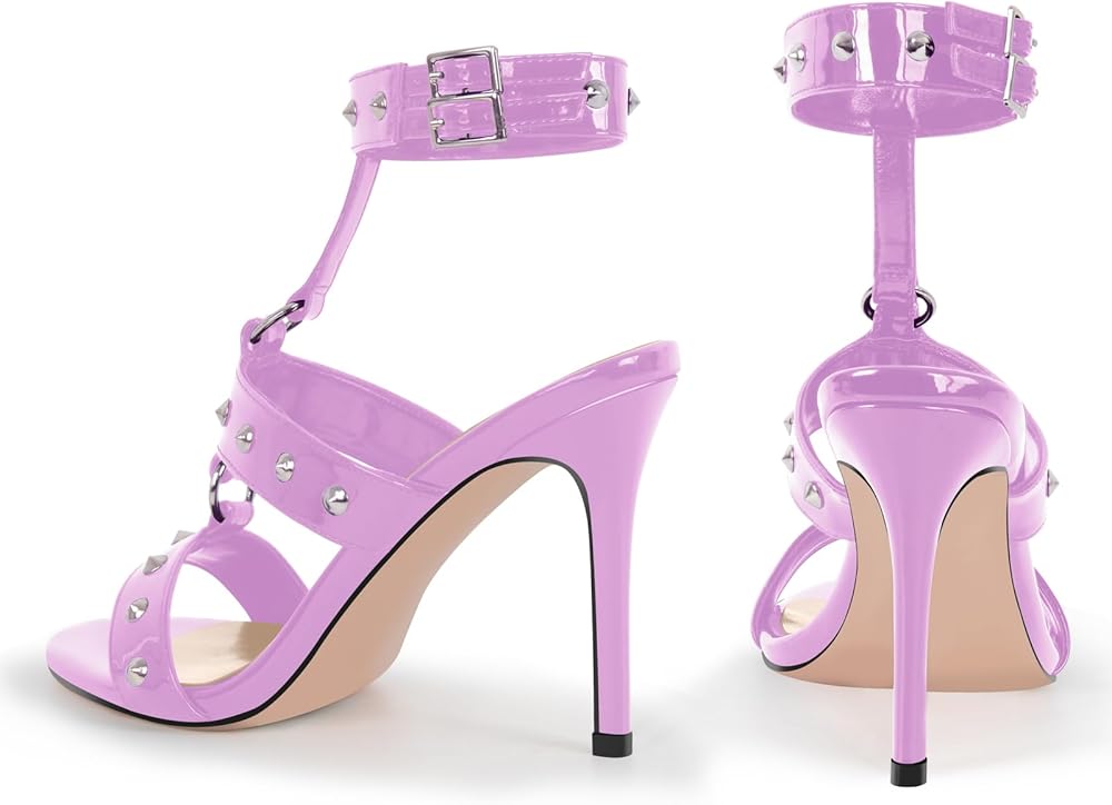 T-strappy buckle up stiletto high heel sandals with whole shoes studded rivets design, unique buckle strappy will definately highlight your chic look.