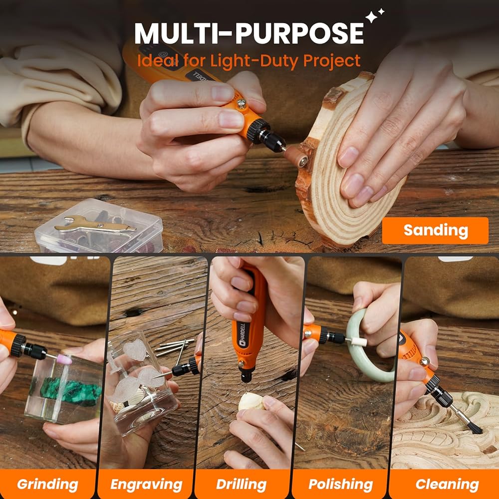 【Powerful performance, unleash your creativity】This rotary tool set is equipped with an upgraded and more powerful motor with 5 speeds (5500-18000 rpm), which can easily handle a variety of small DIY materials. Whether you are carving, engraving or polishing, it can help you perfect every detail and create unique personalized crafts