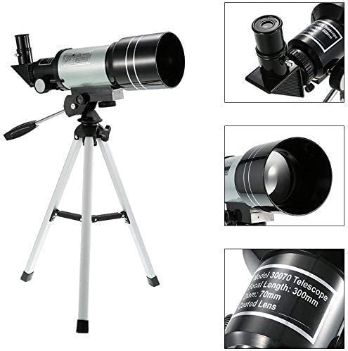 - Refraction telescope, 70mm aperture and 300mm focal length.