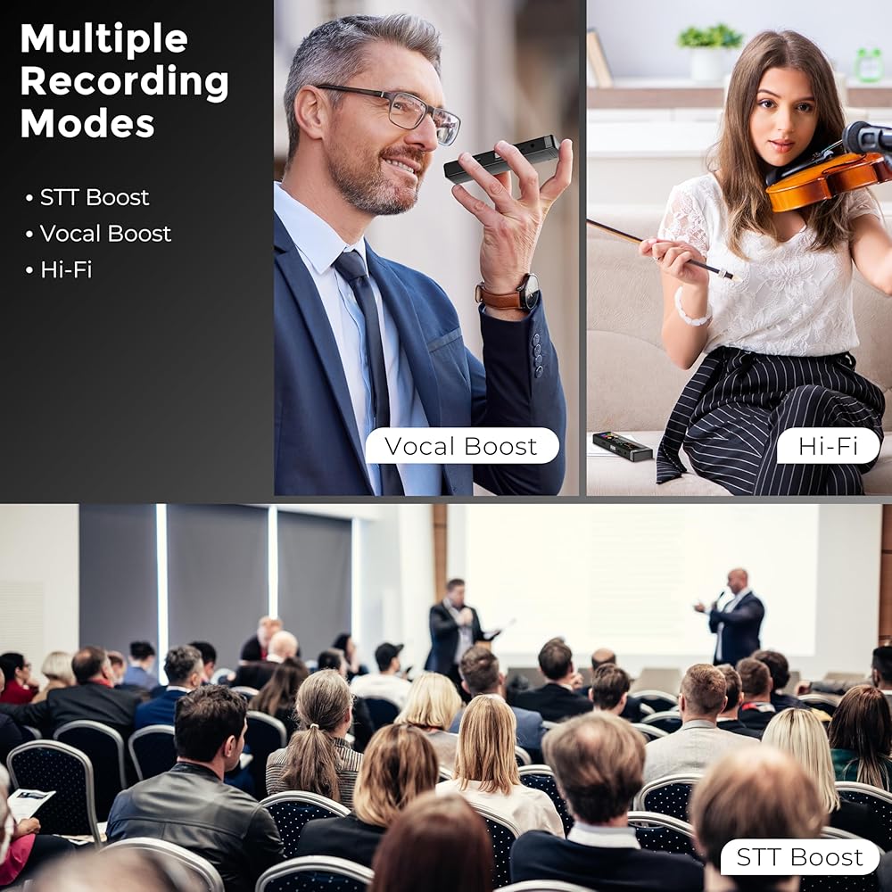 Multiple Recording Modes – The SR1 digital voice recorder offers several preset recording modes, including STT Boost, Vocal Boost, and Hi-Fi, to meet different user needs. It also supports external microphones and Line-in audio input,which helps to achieve clearer recording.