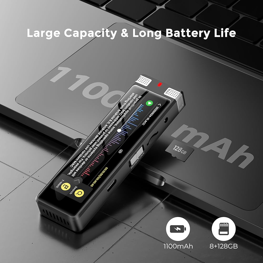 Outstanding Recording Performance – The SR1 AI voice recorder is equipped with dual high-precision microphones and advanced noise reduction algorithms to deliver superior audio recording quality. With 8GB internal storage and 128GB SD card (expandable up to 1TB), it can store approximately 380 to 2200 hours of recordings. The built-in 1100mAh battery supports up to 30 hours of continuous recording.