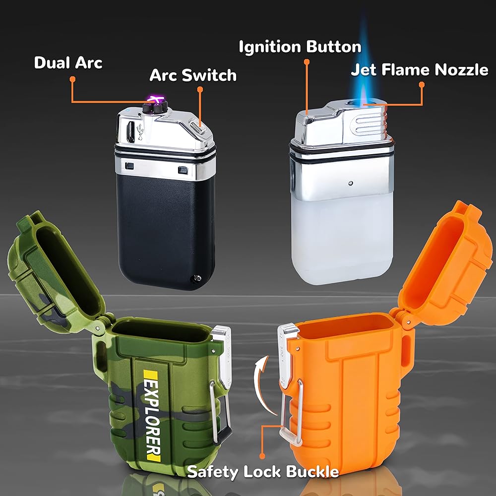 WATERPROOF & WINDPROOF - These 2 lighters are also built with metal-ring sealed cover and locking clasp. IP56 Waterproof System allows them work well in rainy day and windy day. The arc lighter's flameless design and the blue jet flame lighter both have a function of wind resistance. A necessary tactical gear for the outdoors