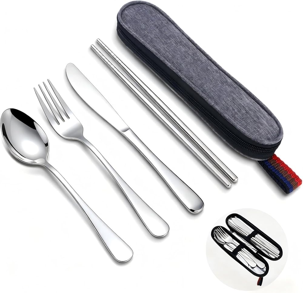 【What You Get】The 5-piece travel cutlery set includes dinner knife, fork, spoon, chopsticks, and premium carrying case. Plus, enjoy peace of mind with long-term support - we'll resolve any issues within 24 hours