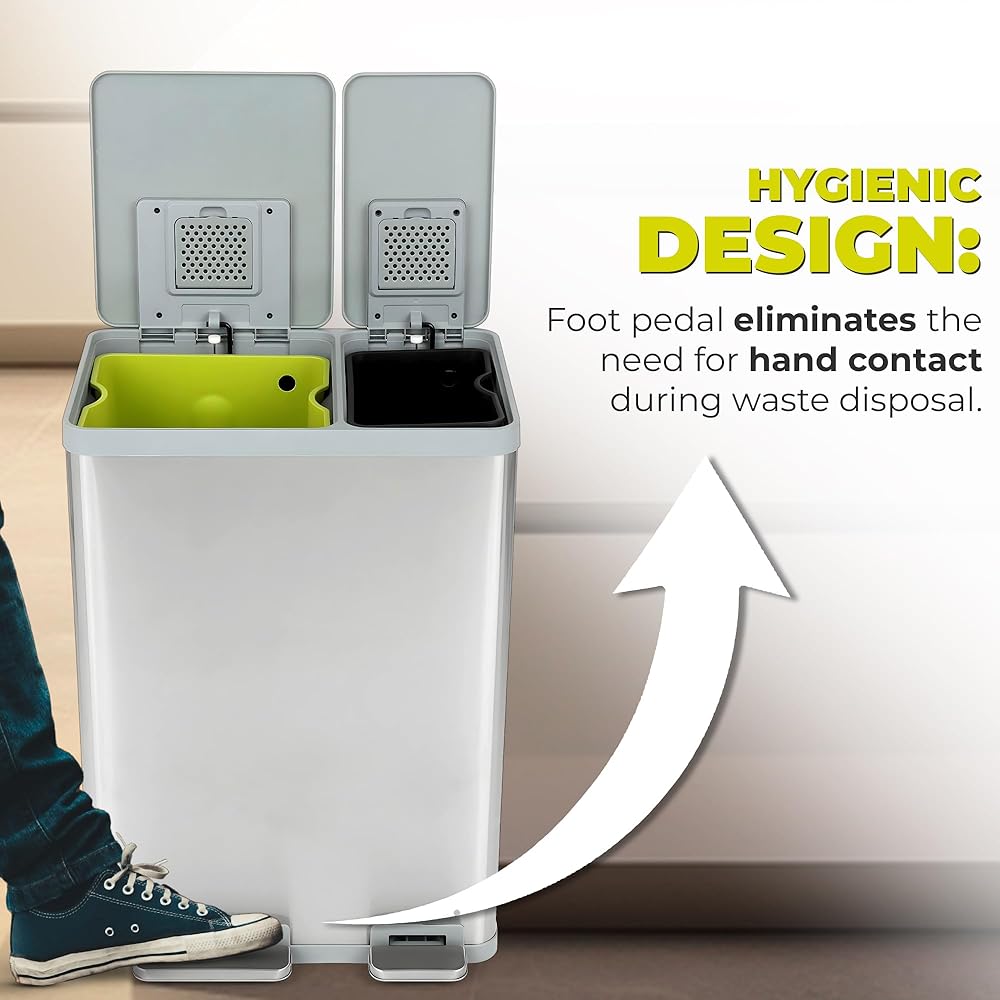 HANDS-FREE USE: The stainless-steel foot pedal stands up to daily use and removes the need to touch the lid during waste or recycling disposal to keep hands clean.
