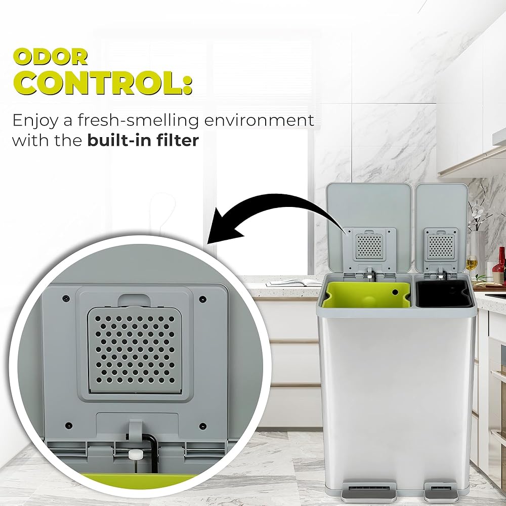 HIGH CAPACITY WASTE AND RECYCLING SOLUTION: Color coded liners in Green (38L) and Black (22L) allow for easy sortation of waste and recycling, without sacrificing waste capacity, and fit standard liners using bag cinch.