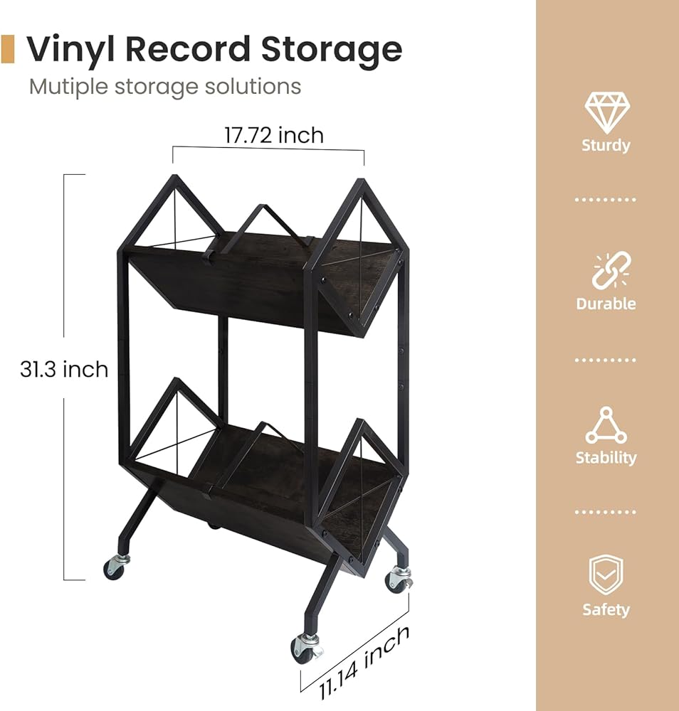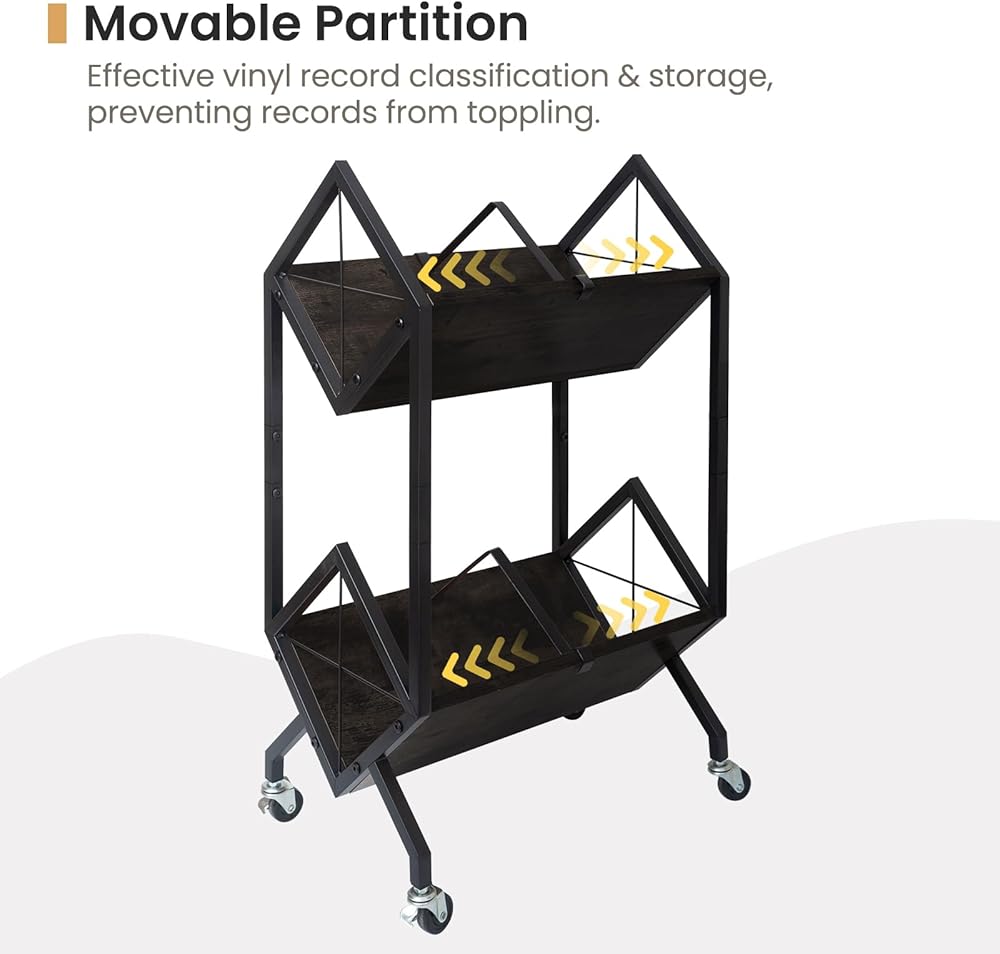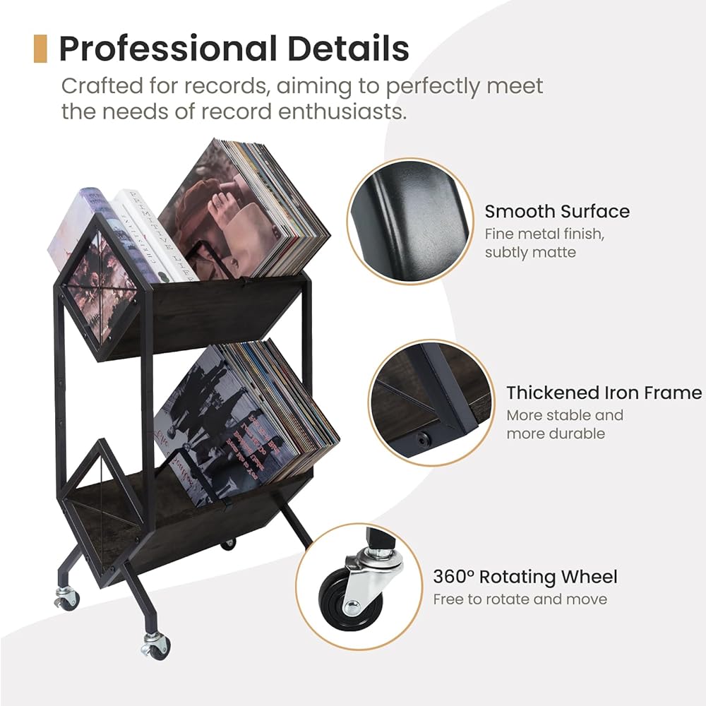 Rolling Storage Cart: This vinyl record organizer comes with four 360-degree steering wheels and brake, enabling smooth and easy movement, even when fully loaded. The high-quality wheels guarantee pushing and pulling easily