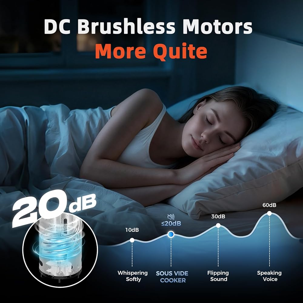 Safe Materials and IPX7 Waterproof:Constructed from food-grade plastic and SUS304 stainless steel, this sous vide cooker ensures safe usage and boasts an IPX7 waterproof certification. The entire unit is washable, while the detachable stainless steel sleeve facilitates thorough cleaning of stains in every crevice