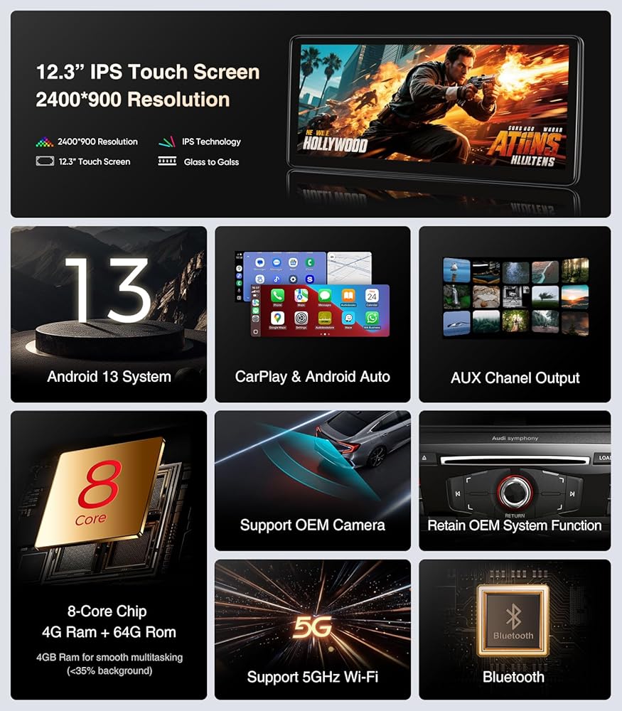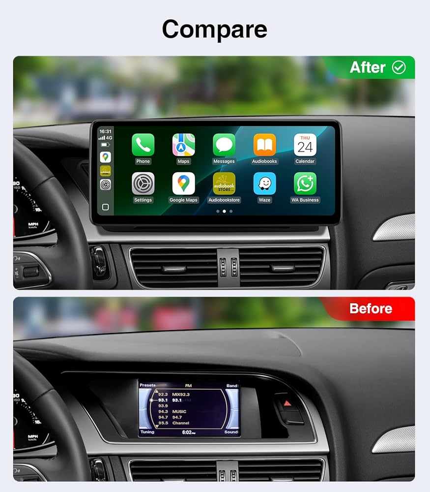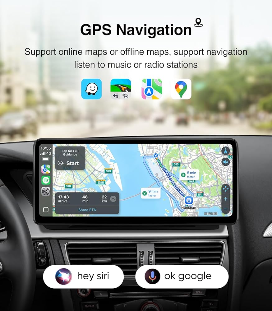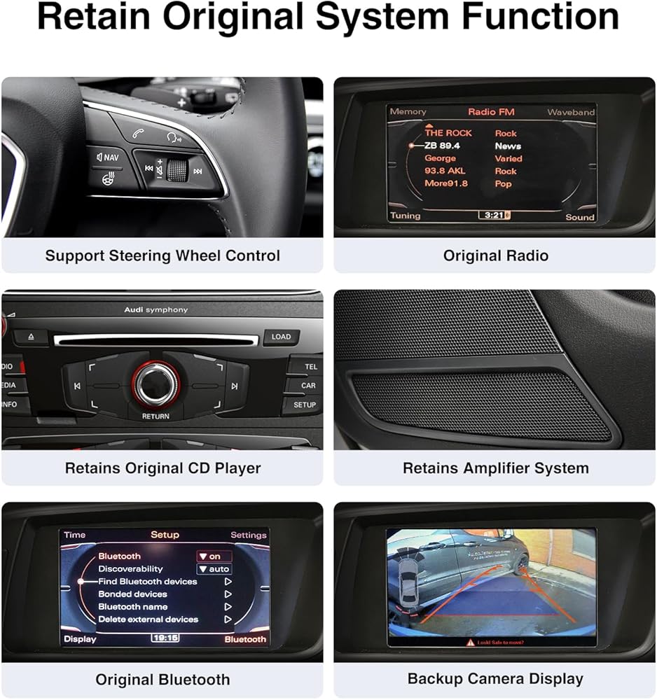 【 Wireless for Audi CarPlay & Android Auto】 iOS 12+ & Android 10.0+ Ready .Seamlessly connect via Wireless CarPlay (A4/S5) or Android Auto – control maps/music on the 12.3" screen. Retain OEM steering wheel buttons & Bose/ Bang & Olufsen amplifiers