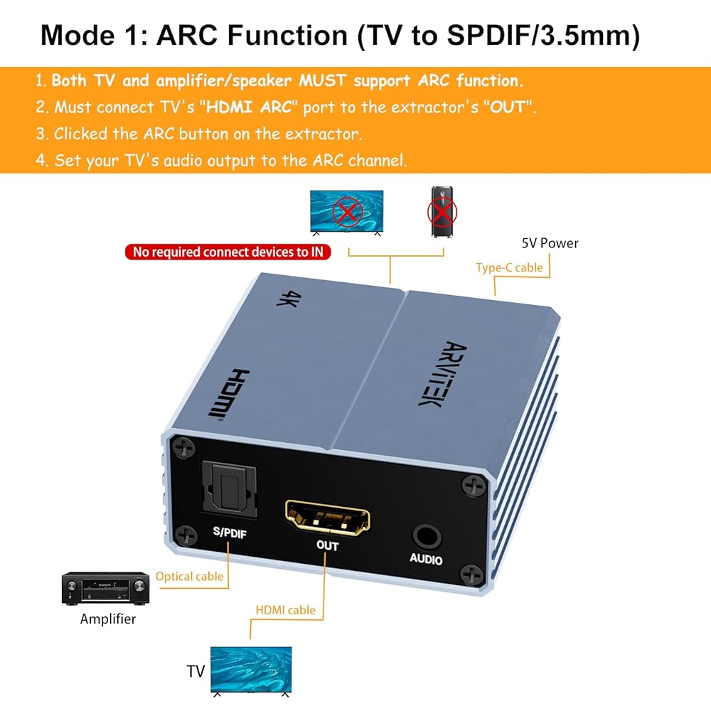 【Work as HDMI Audio Extractor】Arvitek HDMI Audio Extractor can converter audio from ONE HDMI input signal to 1 HDMI output and 2 audio output: optical S/PDIF & 3.5mm AUX. NOT SUPPORT RCA OUTPUT. TV CAN NOT be used as an input source in this mode.