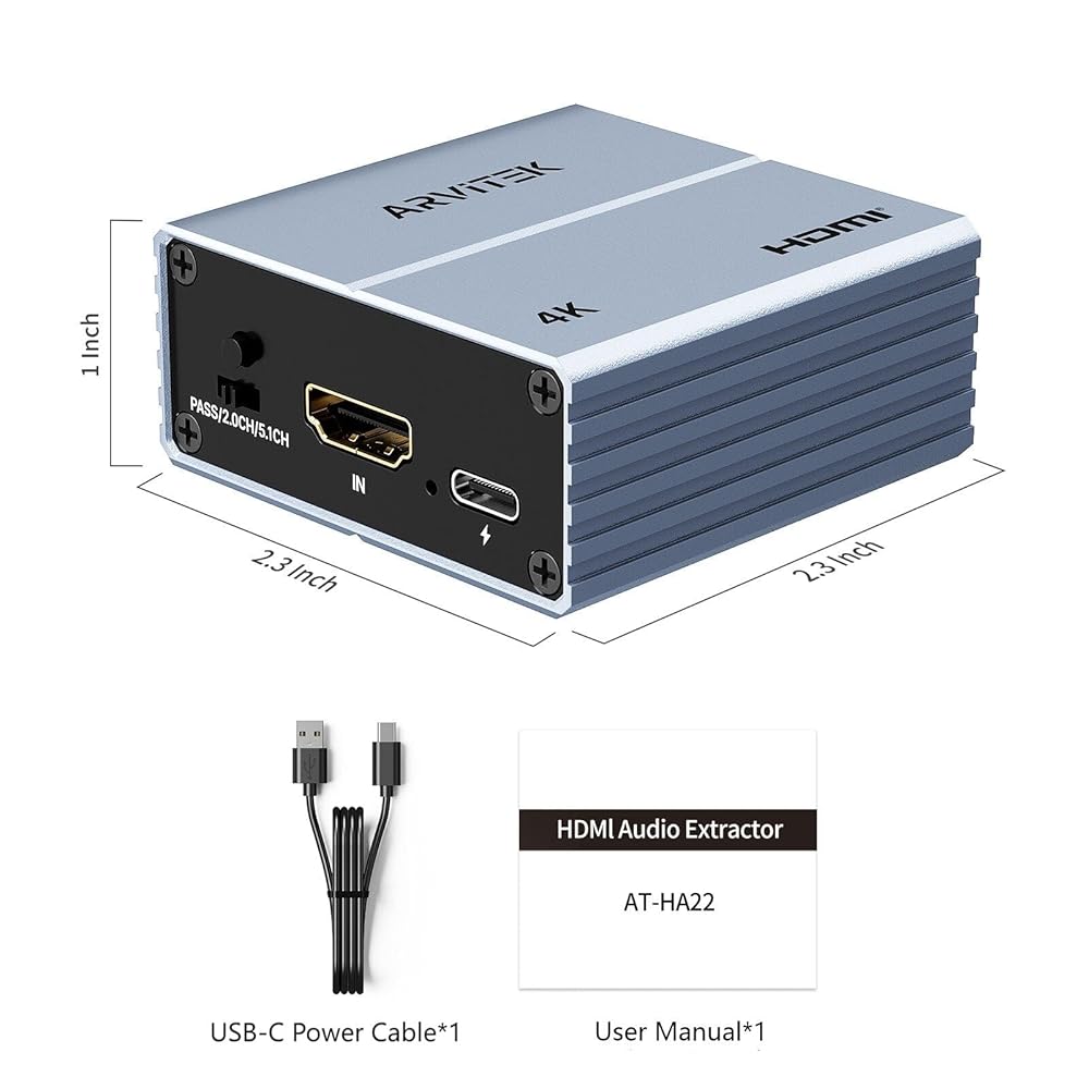 【What You Get】Packing List: 1 x HDMI ARC Audio Converter (size: 2.3 x 2.3 x 1 inch), 1 x Type-C Power Cable (NOT included 5V power adapter), 1 x User Manual. The item is quite small, and easily fits behind the HDMI or audio devices.