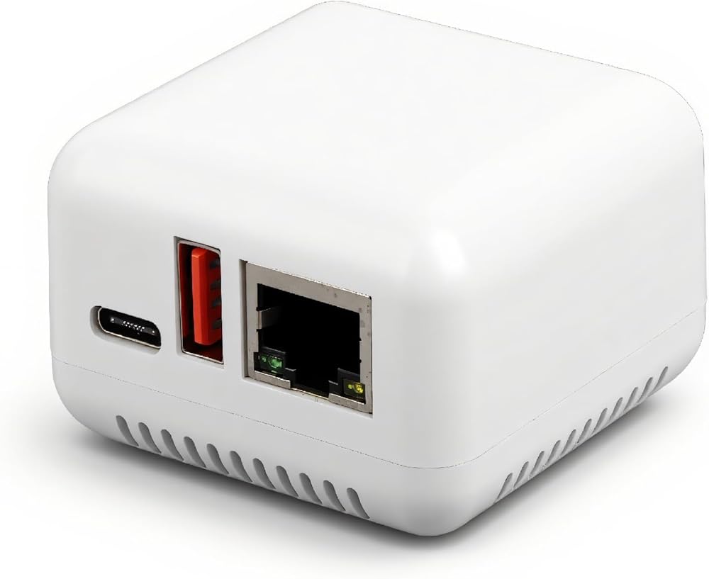MULTIPLE INTERFACES: Computer print server adapter with Type C power supply port, printer USB connection port, and network cable interface.