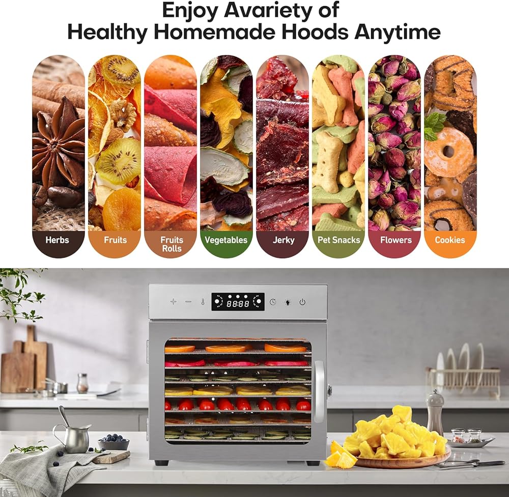 Versatile Dehydration Options: Perfect for a variety of foods including fruit, herbs, meat, and dog treats, this dehydrator preserves natural flavors and nutrients, delivering healthy, tasty results every time.