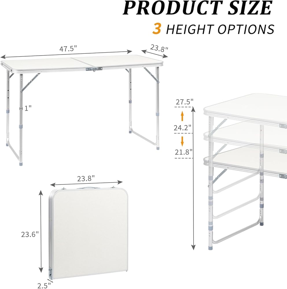 【Adjustable Height】 The height of the table can be adjusted to three levels (21.65”, 24.41”, and 27.56”). Whether you are cooking or preparing food on the table outdoors, or your children are placing game toys on it at home, it can meet your requirements for the table height