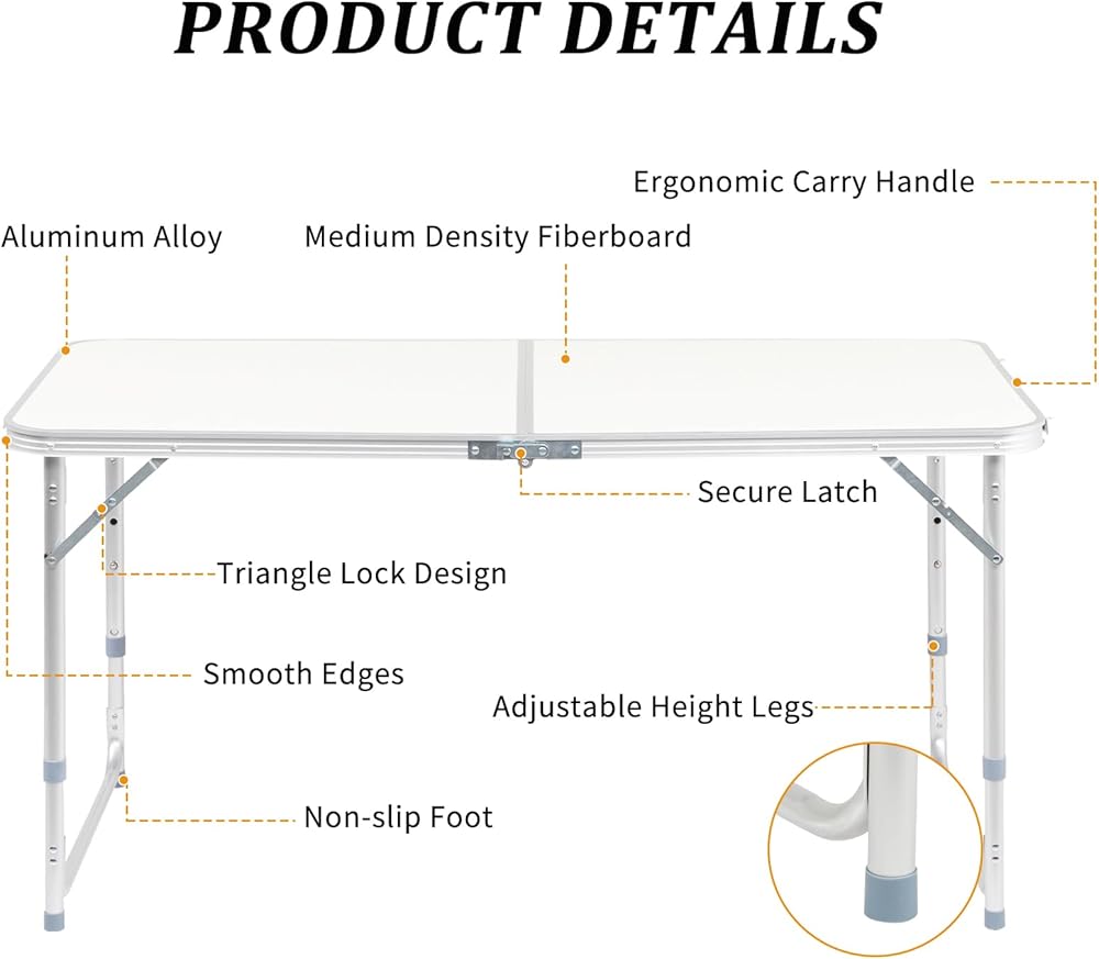 This folding table is designed for ultimate convenience and durability. Made from lightweight aluminum alloy, it weighs only 6.8 pounds and measures 22.7 x 20 x 1.2 inches when folded, making it easy to carry and store. It can be quickly folded and unfolded in seconds without any tools, perfect for emergency or temporary needs. The table features a stable structure with strong load-bearing capacity, capable of supporting up to 88 pounds.