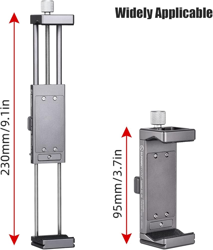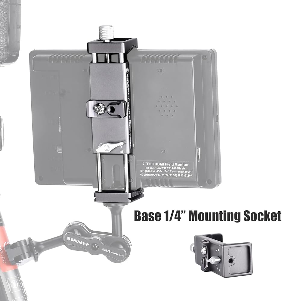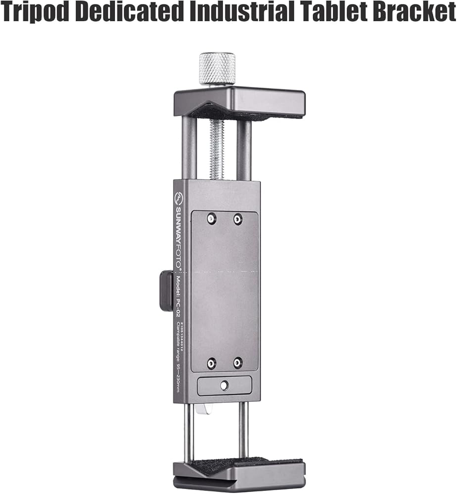 PC-02 tablet computer bracket is elaborately CNC machined and with Type III hard anodized finish for its resistance to abrasion and corrosion. Compatible with PAD width from 95 to 230mm, and the Arca standard dovetail ensures its perfect match with professional tripods to carry out more functions easily. The base 1/4” mounting hole can be mounted on tripod directly.