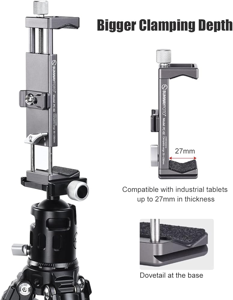 PC-02 has a clamping depth of 1.06in (27mm), compared with regular tablet bracket, it's specially designed to work with thicker industrial tablet or tablet with thick protective casing.