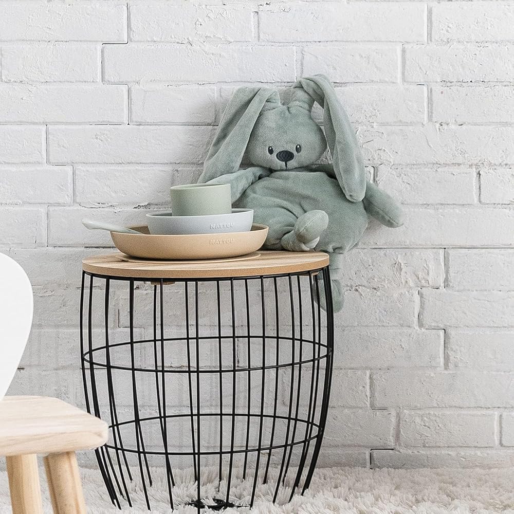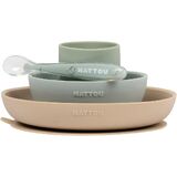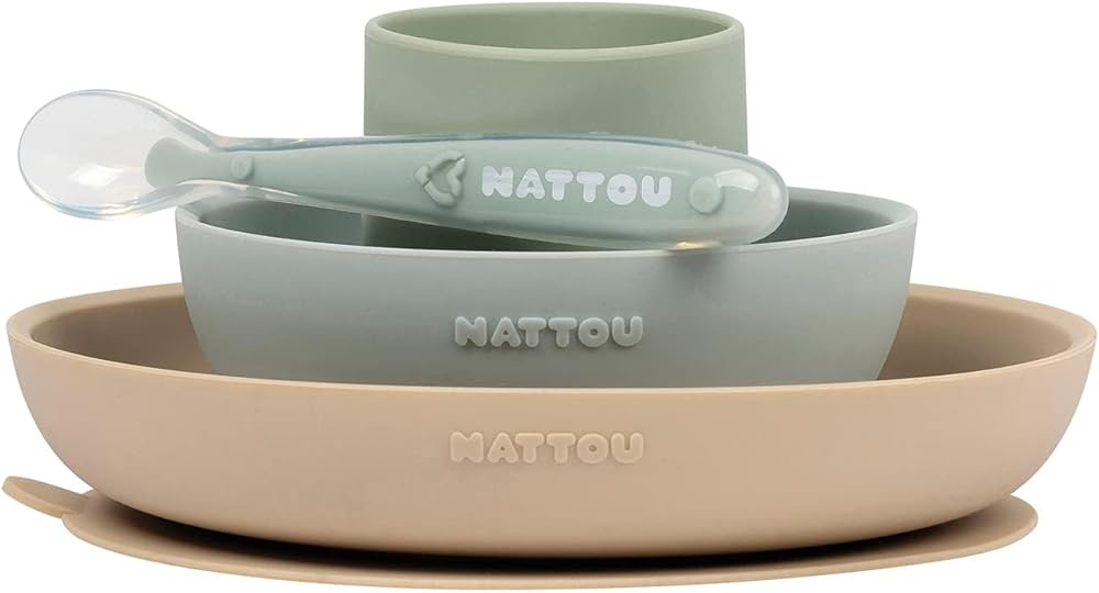 Nattou Silicone Tableware for Children, 4 Pieces, Plate + Bowl, Non-Slip, BPA-Free, Silicone, Green/Sand