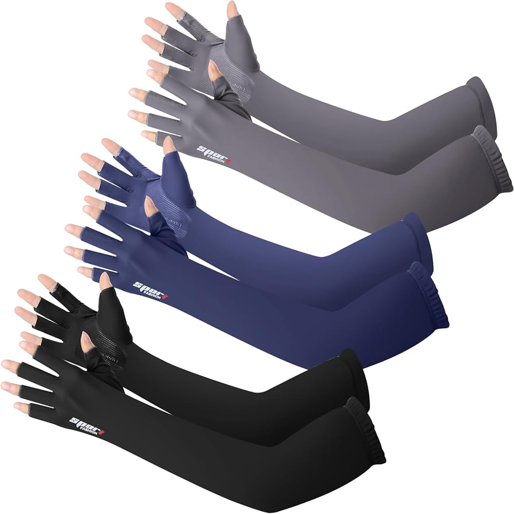 Unisex UV Protection Gloves: you will receive 3 pairs of UV protection gloves in black, navy blue and gray; Each glove is about 20 inches long; Palm width is 3–4.7 inches, circumference 6.7–9 inches; The 5 inch - wide cuff has a 10-inch circumference and is elastic, stretching to 6.5 inches wide and 14 inches around; Manual measurement may cause slight errors; Choose carefully if concerned