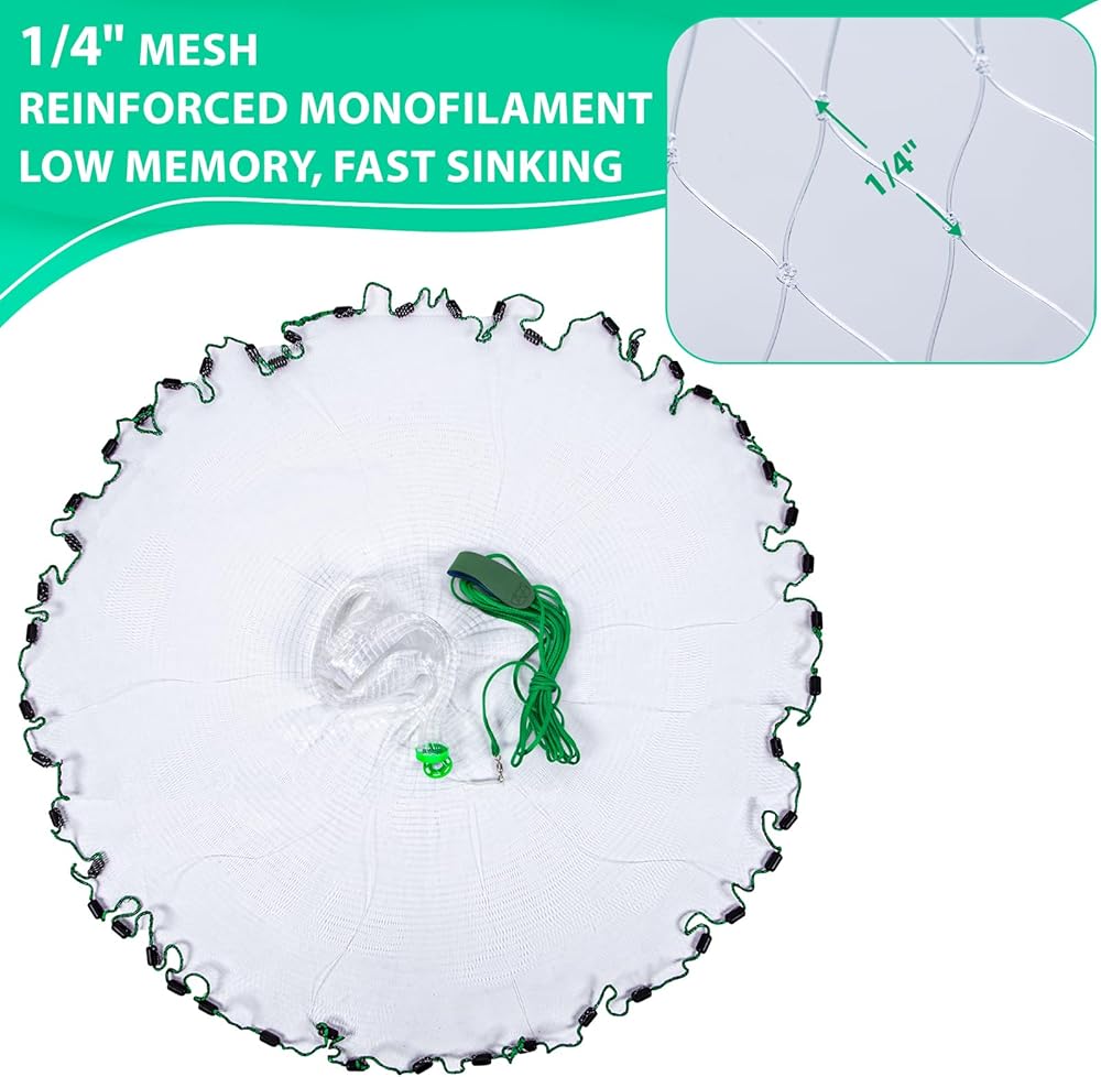 Reliable Material: These cast nets are made of monofilament mesh and black sinkers, easy to throw successfully and sink quickly to ensure a good haul. Whether you are a novice thrower or an experienced angler, this casting net is easy to open, making catching your live bait easy and fun.