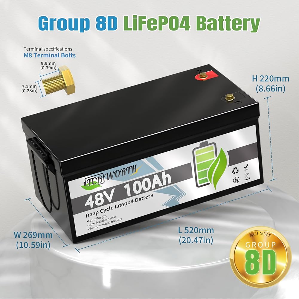 【BCI Group 31 Size, Universal Fit】TCBWORTH 12V LiFePO4 Battery 100Ah was built based on the most ubiquitous size of the BCI battery size standard "Group 31", allowing it to function effectively in a variety of vehicles and applications. It is globally compatible with the Group 31 battery box . It is a perfect replacement for Group 31 lead-acid and AGM, SLA batteries, no maintenance or complicated operation or wiring is required