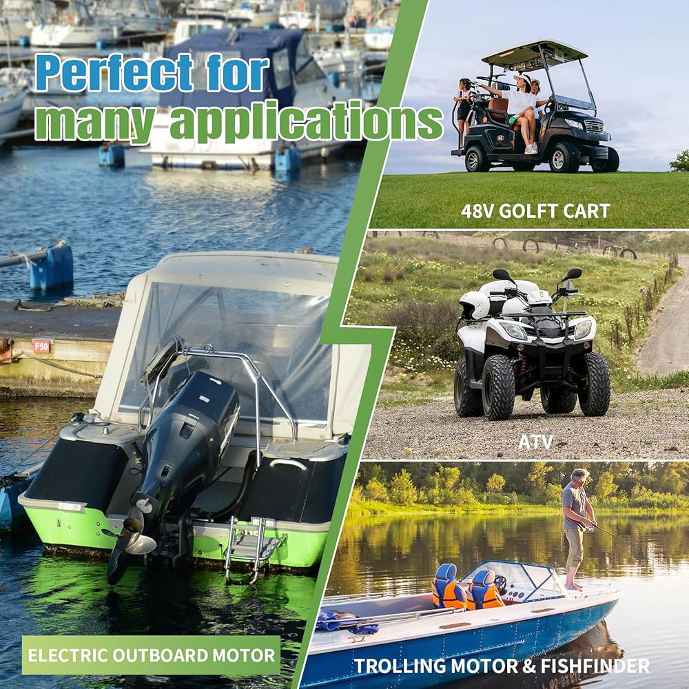 【Charging & Discharging features of the 12 Volt lithium battery 100Ah】the max continuous discharging current is 100A. the inrush current is 200A within 3-5 seconds. charging voltage we recommend for LiFePO4 Battery 12V is 14.6V, charging current recommended is less than 50A. widely can be used for Rv, boat, marine, trolling motor, solar, camping, off-grid applications, UPS, radio, sump pump etc.