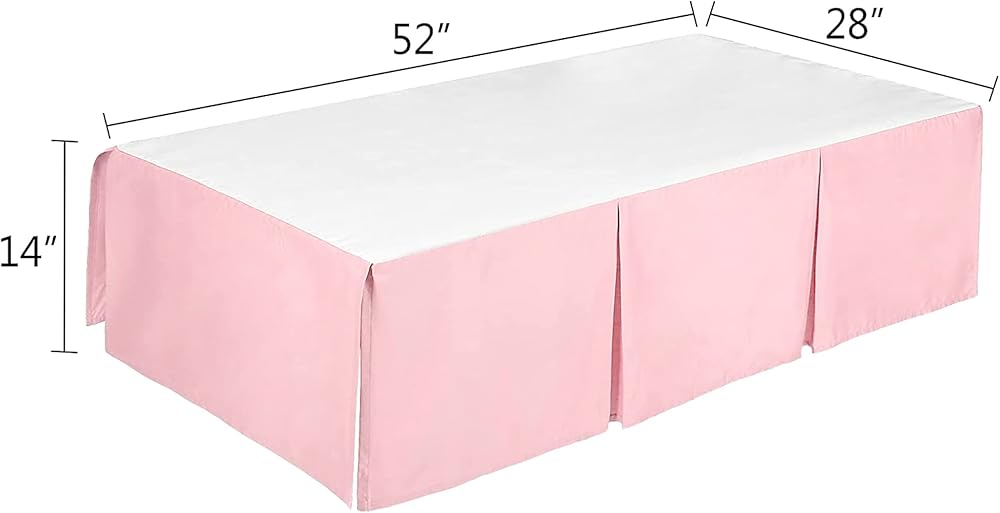 PERFECT FIT: Measuring 28” x 52” with 14'' drop, this crib skirt fits perfectly on all standard cribs and most toddler beds. The 14'' length is long enough to discreetly hide storage under the crib. Finished with 4 split corners to make placement around crib posts easy, and is convenient to change and wash