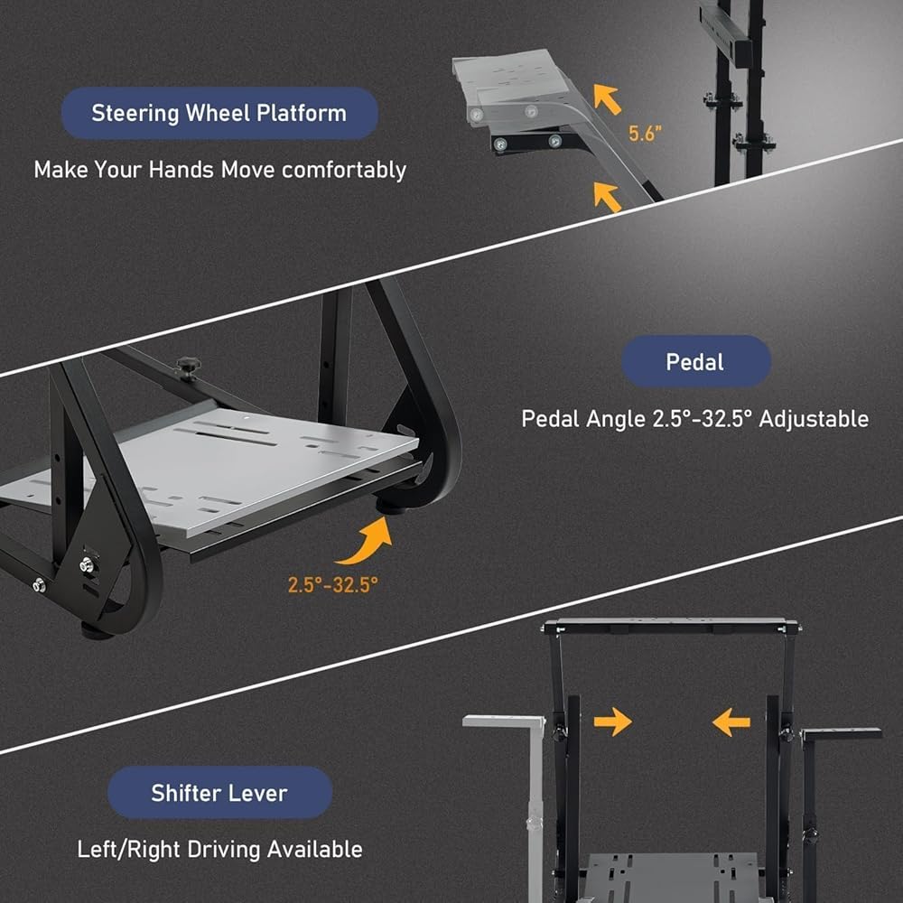 【Fully Adjustable】The racing simulator cockpit is adjustable on demand: bracket height, pedal angle, seat position. Shift lever can be adjusted left or right. The gearshift can be mounted on the left or right side as desired