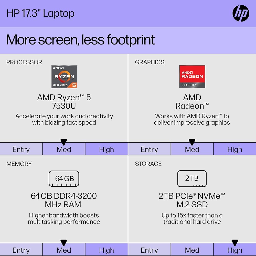 AMD Ryzen 5 7530U: This HP 17 inch Laptop Equipped with AMD Ryzen 5 7530U processor, 2GHz(Up to Turbo Boost 4.5 GHz, 6 cores, 12 threads), delivers excellent performance for demanding tasks. With this processor, you can effortlessly handle multitasking, intensive applications, and smooth overall system performance