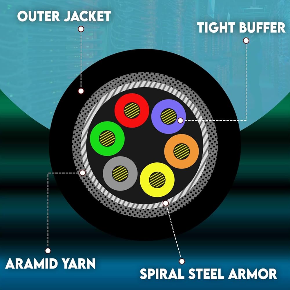 Our Steel Armored Fiber Optic Cable features Spiral Steel Armor, 12 strands of OM3 50/125um Multimode Corning ClearCurve Multimode core, and an aqua riser rated jacket.