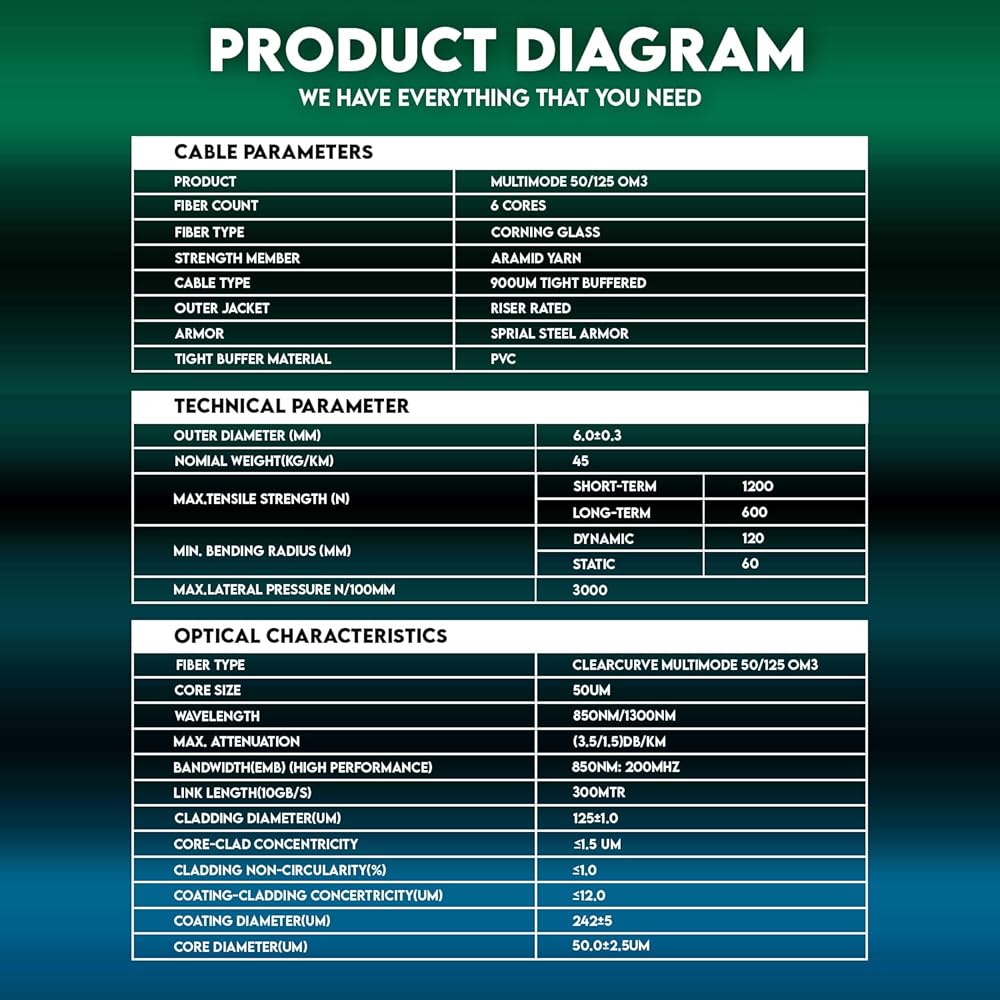 OM3 50/125 Multimode: Our cable features OM3 50/125 multimode fibers, designed to optimize performance in high-speed applications, providing excellent bandwidth, low latency, and enhanced connectivity.