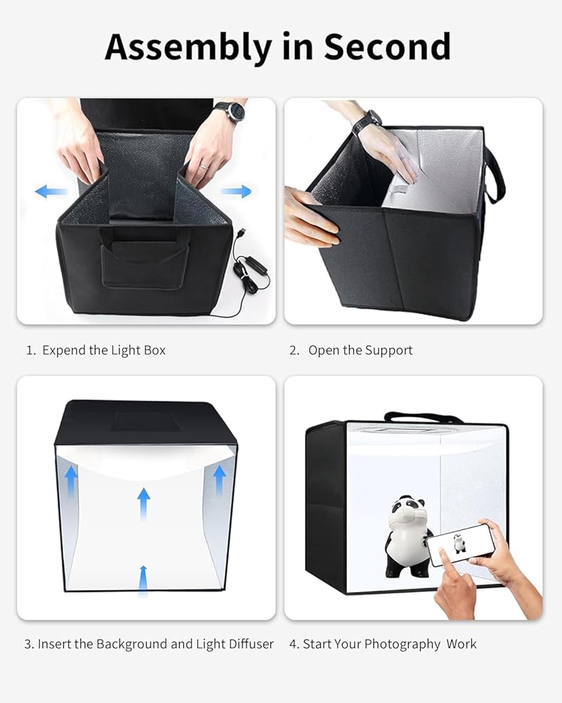 Portable & Quick Setup: Measuring 14x10 inches, this photography box features a unique folding design that assembles in just 10 seconds—no brackets, screws, or complex setups required. Comes with a durable, waterproof carry bag, making it compact and easy to transport. Perfect for use in any space without taking up much room, providing convenience wherever you need it.