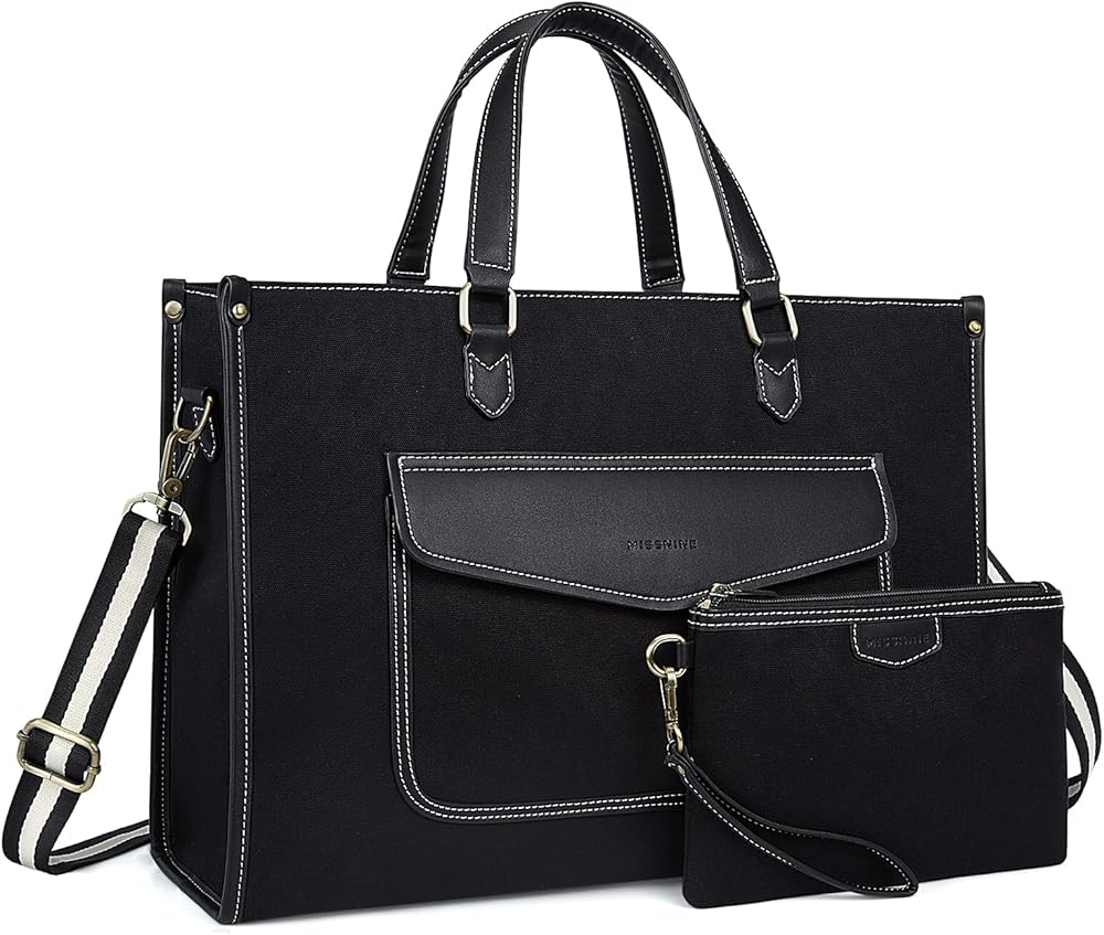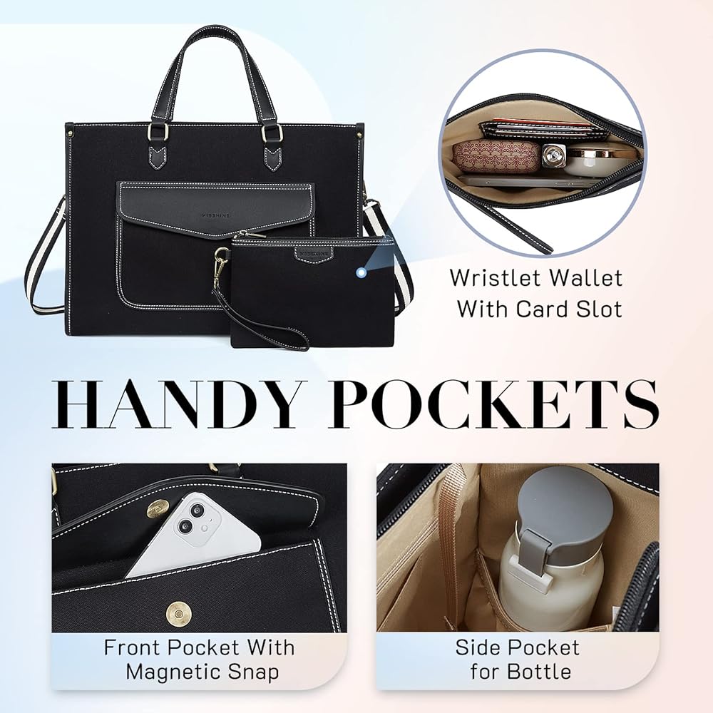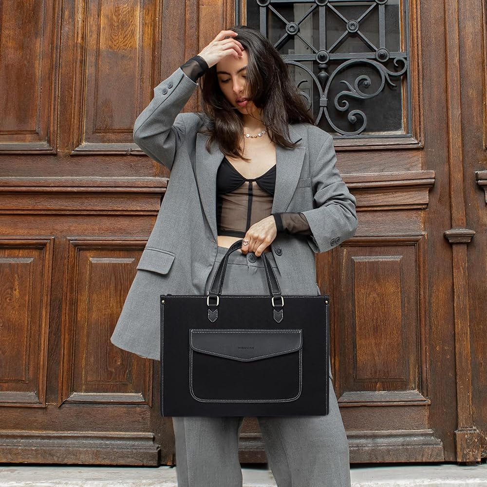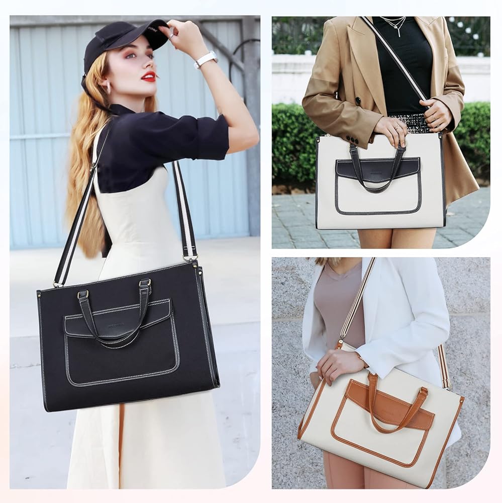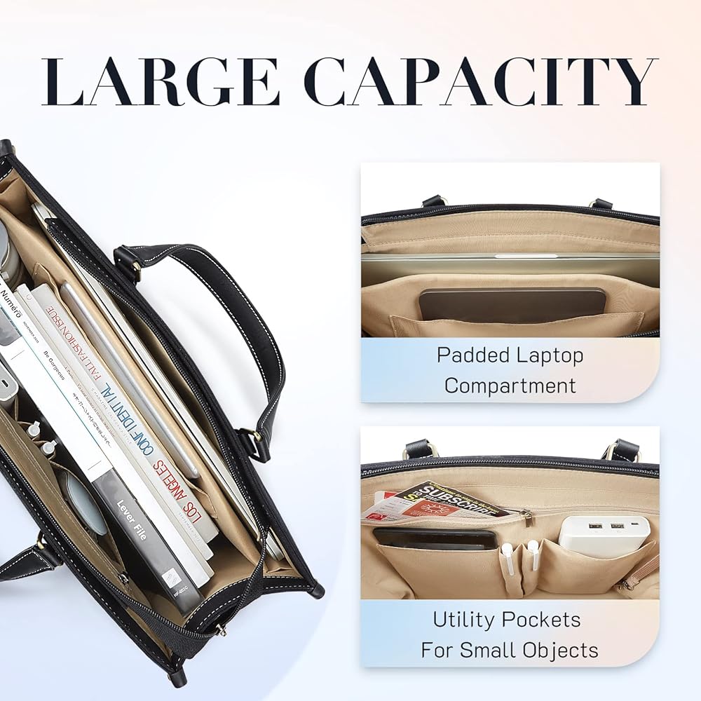 Structured Laptop Bag - 16.1”L x 12.2”H x 5.5”W, secured with zipper closure, the tote bag features a separate padded laptop compartment for your laptop up to 15.6'', a tablet slot for 10.9'' iPad, plus 5 inner pockets for your small items.