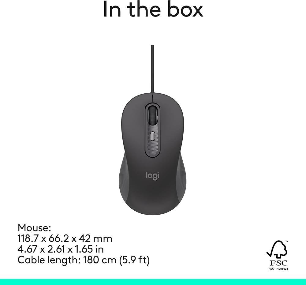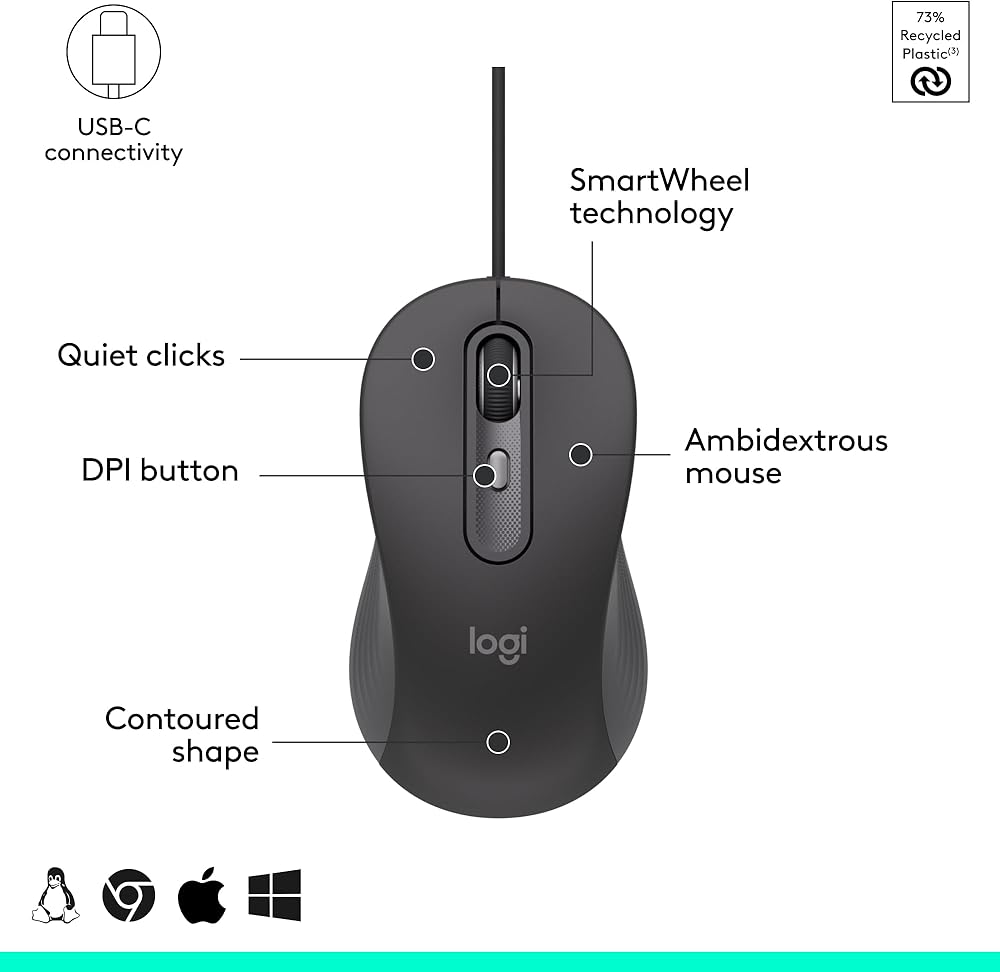 Designed for workplaces that require wired solutions, Signature Wired M520 L for Business delivers an improved user experience with wired connectivity for everyone. The USB-C wired mouse comes in a contoured, ambidextrous shape that fits nicely both left-handed and right-handed people. Improve efficiency by switching between line-by-line or super fast scrolling with a flick of the SmartWheel. Promote focus with Silent Touch technology, which reduces 90% of clicking noise (1). Adjust mouse sensitivity with a DPI button, which is also customizable with Logi Tune. Deploy easily with multi-OS compatibility. View and check device status at a centralized level with Logitech Sync. Designed with sustainability in mind, the M520 L mouse improves power efficiency by consuming 68% less energy compared to the M500s mouse. The plastic parts are made with 73% post-consumer recycled plastic (5), and the product is shipped in FSC-certified paper packaging.