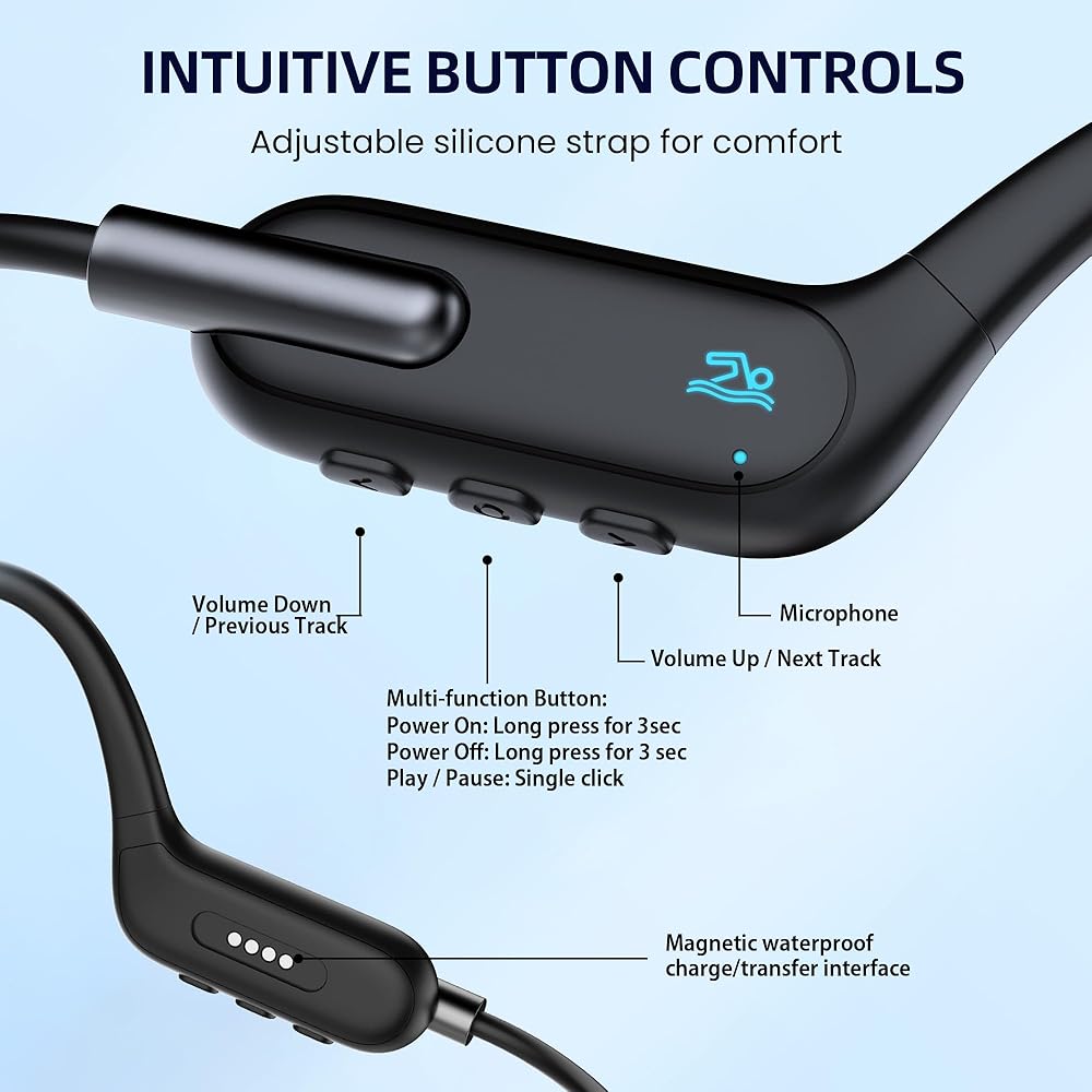 🏊 IPX8 Waterproof for Swimming & Underwater Use: Designed for swimmers, these bone conduction headphones are IPX8 waterproof-rated, allowing immersion up to 2 meters for 2 hours. Enjoy music underwater with the built-in MP3 mode—perfect for swimming, diving, and pool workouts. (Note: Bluetooth is not supported underwater.)