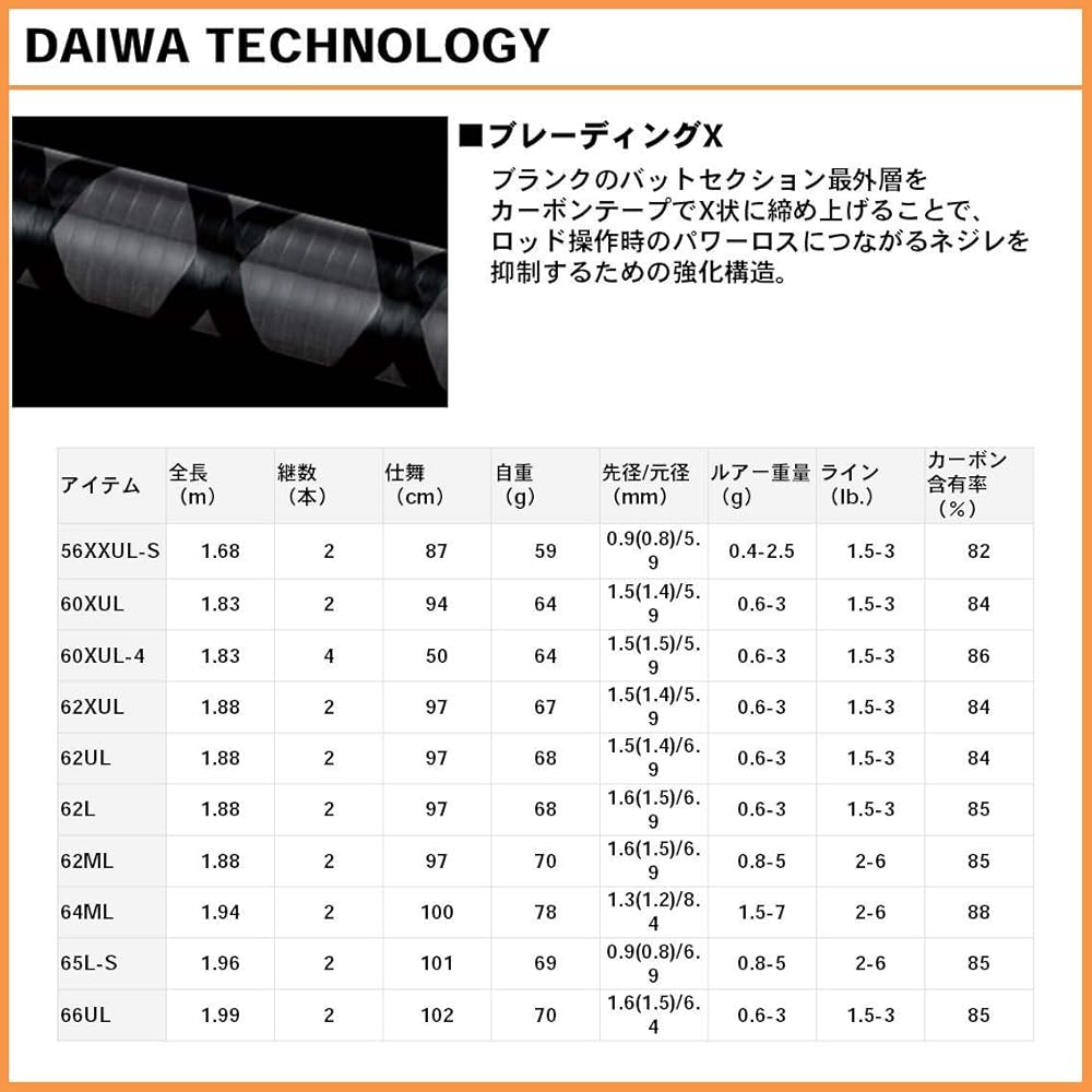 Tip Diameter: 0.06 inch (1.5 mm) / Base Diameter: 0.2 inch (5.9 mm) / Lure Weight: 0.6 - 3 g); Compatible Lines: 1.5 - 3 lbs; 10 items ranging from 5 ft 6 inch / XXUL action to make it easy to carry, 4 piece model for large pounds