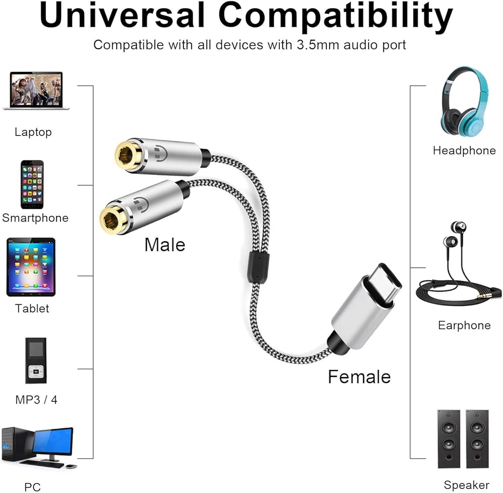 Wide Compatible: This headphone splitter for ipad pro can work for most devices with Type c port like Ipad Pro , Cellphone , Laptop, Tablets , PC , MP3 player. the output female jack port can connect with headphones , headsets , speakers that have 1/8 auxiliary jack port