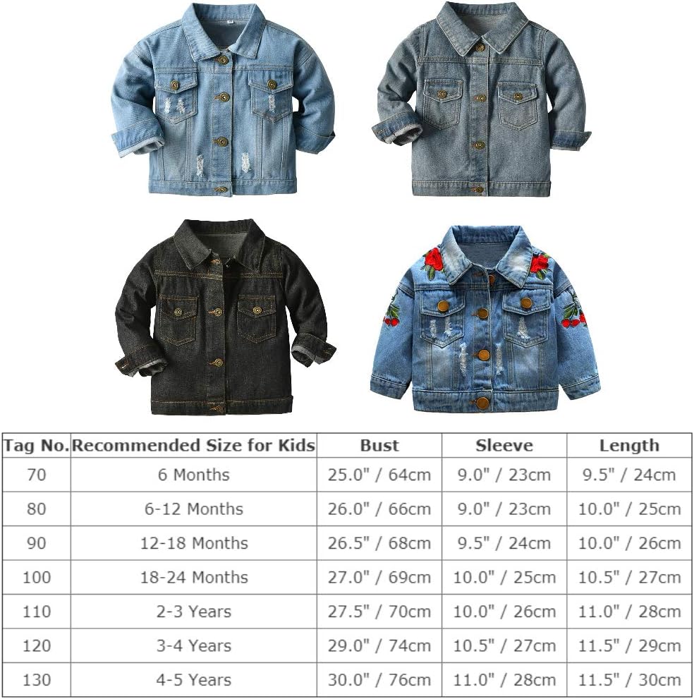 ✤ SUITABLE SIZE: Kids cute colored denim jackets windproof top for 6-12 Months, 12-18 Months,18-24 Months, 2-3 years, 3-4 years,4-5 years 5-6 years, 6-7 years boys girls. To see more details, please check our size chart before ordering. To find a best size, you can also ask other customers or send us an e-mail. We are always at your service.