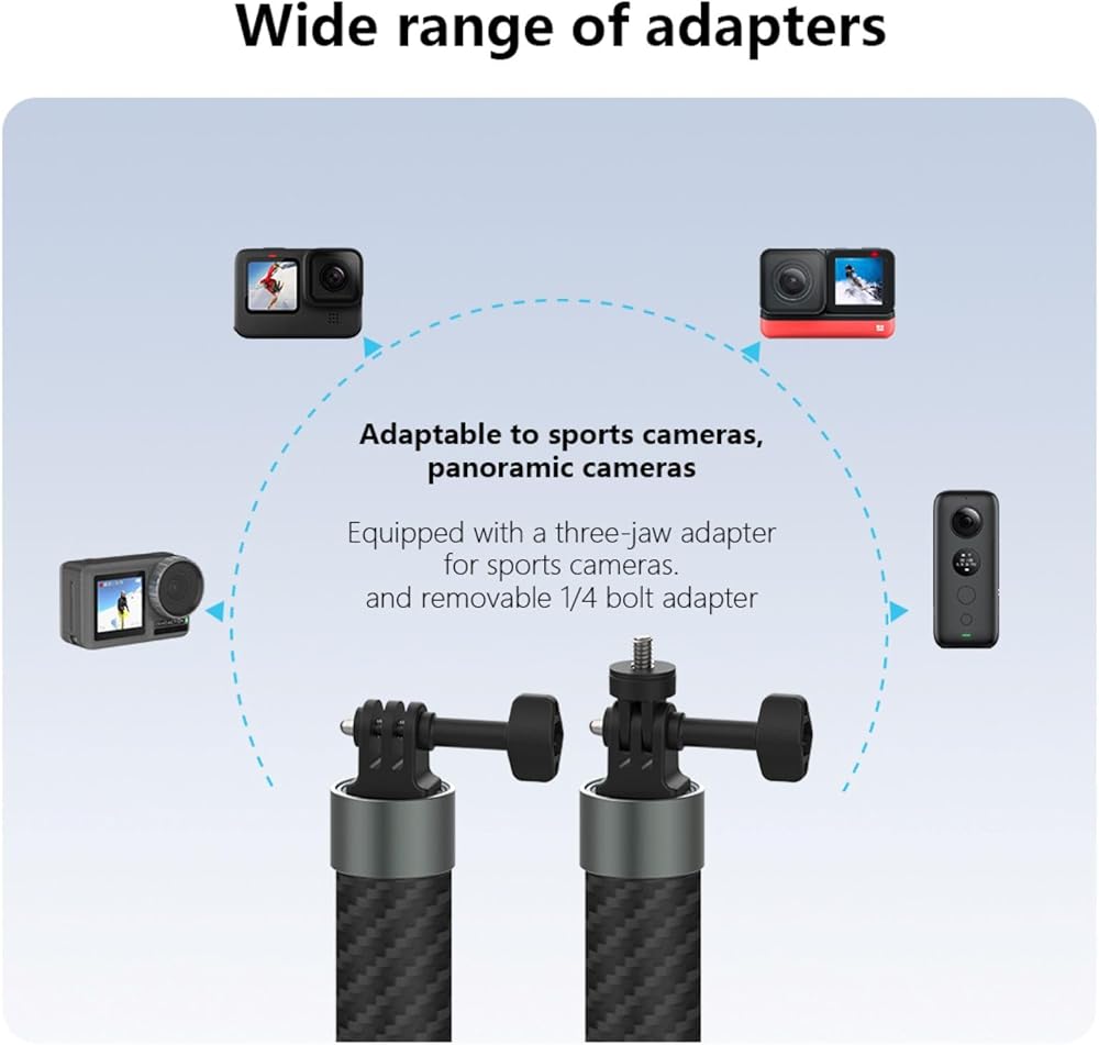 Compatible for GOPRO HERO 13 12 11 10 9 8 7 6 5 series, DJI Action 5/4/3, Osmo Pocket 3, Insta360 X4/X3/GO 3S/Ace Pro 2, and more sport wearable camera. Weighing just 9.88oz/280g, this ultra-light carbon fiber pole stretches from 16.93" to 102.36" in seconds, surviving well in rain, snow, and saltwater condition.