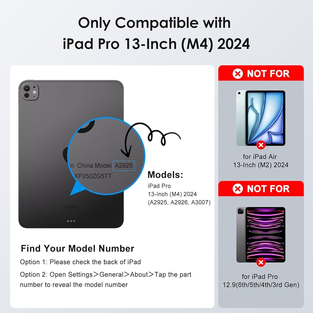 Compatibility: This premium slim keyboard case is ONLY compatible with iPad Pro 13-inch (M4) 2024 (A2925, A2926, A3007). NOTE: NOT COMPATIBLE WITH iPad Air 13-Inch (M2) 2024 and iPad Pro 12.9(6th/5th/4th/3rd Gen).