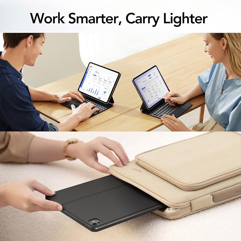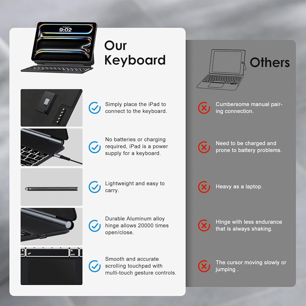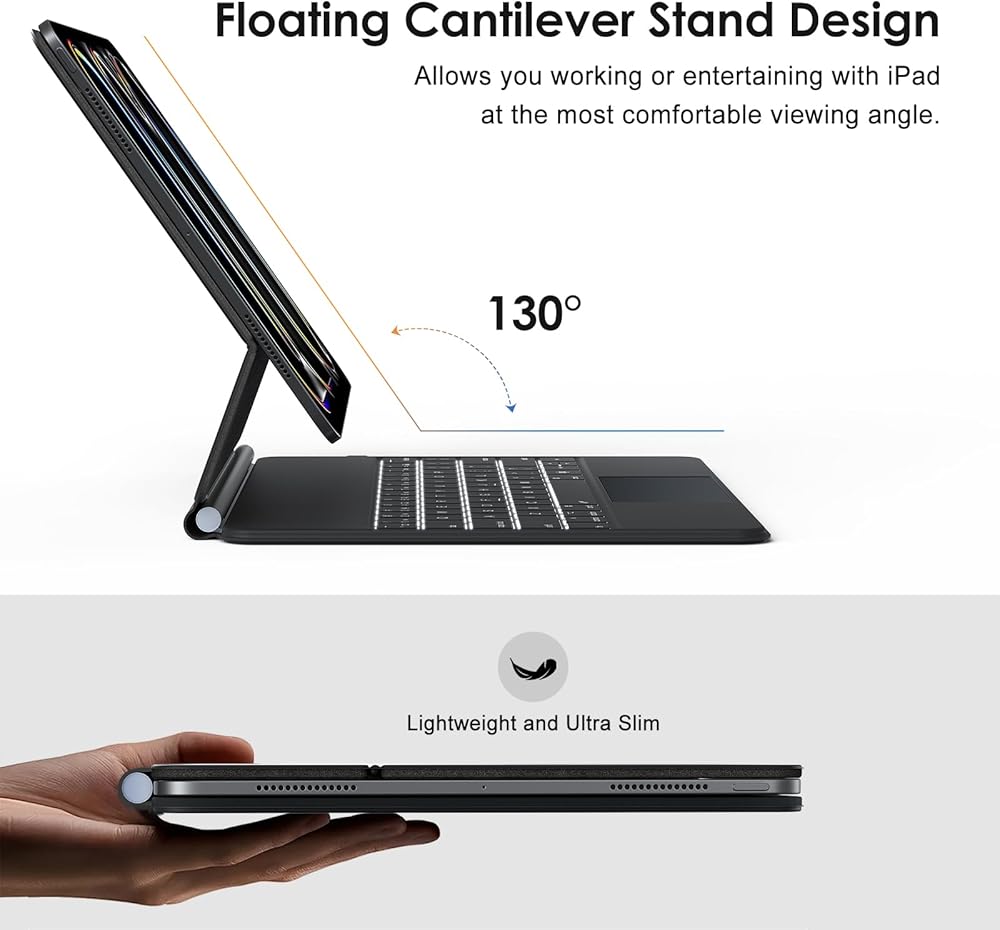 Easy-Set Magnetic Stand: you can attach your iPad to the back cover magnetically, Set the floating cantilever stand with one smooth motion, and transform your iPad turn your tablet into a highly performant and easy-to-use laptop within a second! Which is perfect for traveling, business, and school.
