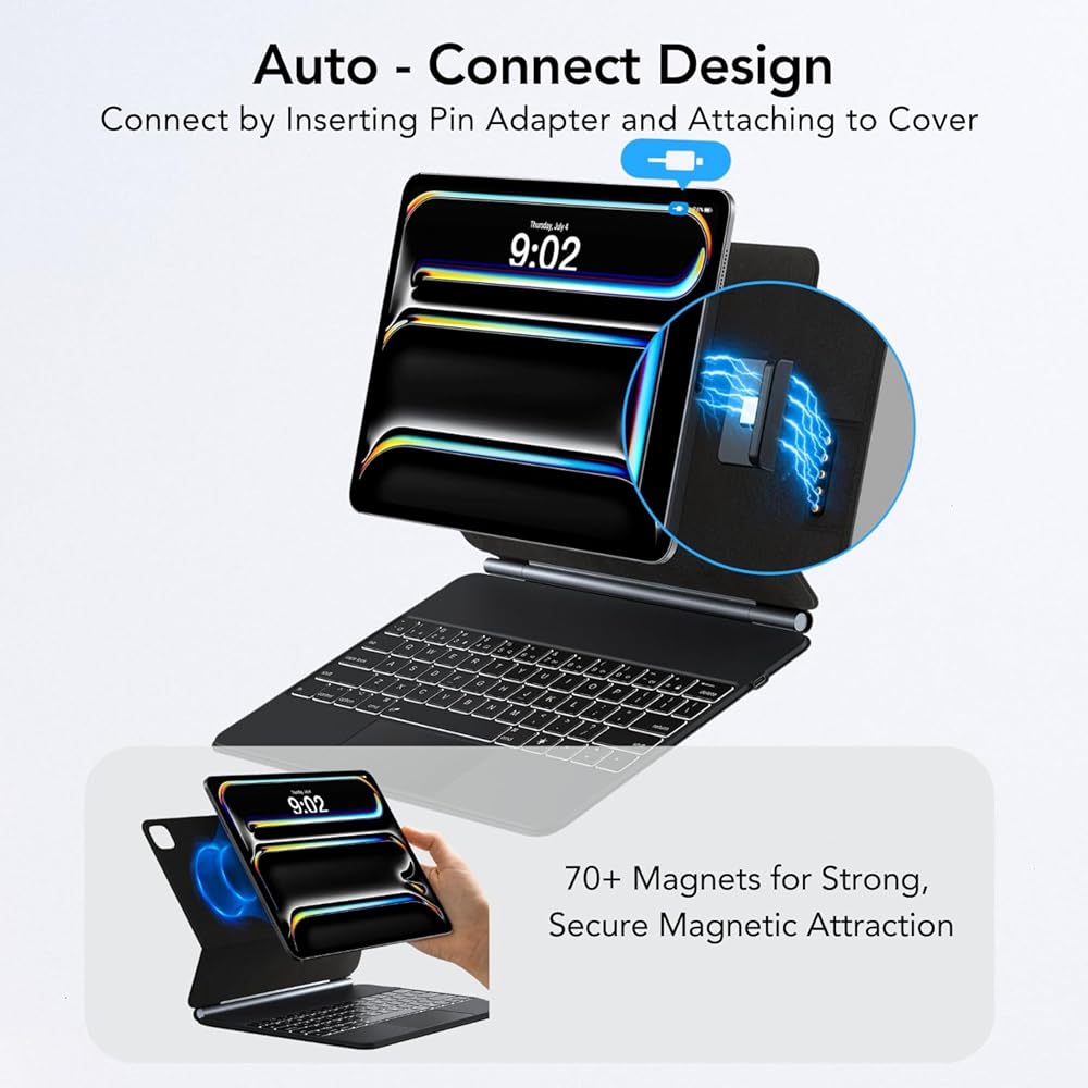 Auto-Connect Design: After inserting the included PING adapter, simply align the back of your iPad with the contact points on the rear cover of the keyboard case and gently place your device, it will automatically connect to the keyboard instantly without the need for manual pairing. This fast and stable connection ensures that you can start using the keyboard case immediately with no additional steps, offering a smoother and more efficient experience.
