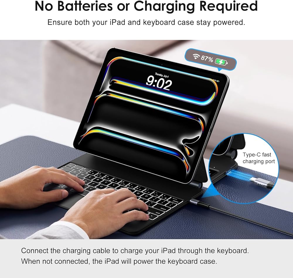 Efficient Charging Method: When you connect the charging cable, the keyboard case powers itself and simultaneously charges your iPad. This eliminates the need for a separate charger. When the cable is disconnected, the iPad will power the keyboard case, reducing the need to frequently plug and unplug chargers. To keep both your iPad and keyboard case in optimal power condition, ensure they are properly connected when charging.