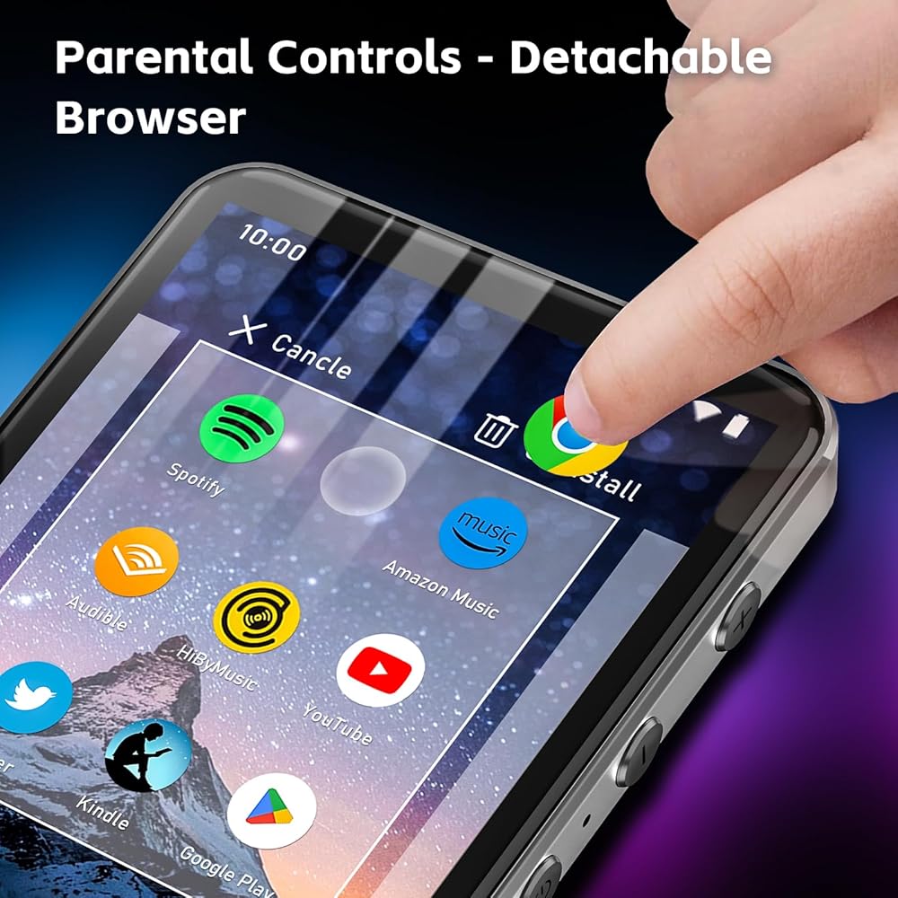 【Friendly MP3 Player】Bluetooth MP3 player offers the flexibility to install new apps and update existing ones to the latest version at any time. Its parental control feature ensures that children can only download apps with explicit authorization, providing a secure environment. Additionally, you can easily remove unnecessary apps to save memory and enhance device performance.