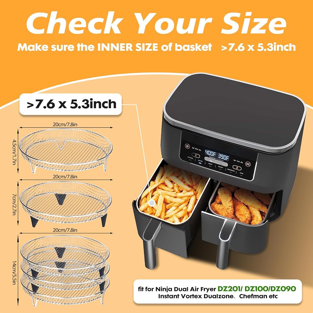 【Check Size of your Air Fryer】Make sure the INNER SIZE of basket >8inch. ( Stainless Steel Air Fryer Rack Tray fit for most round Air Fryer, Pressure Cooker, Oven, 4.2Qt、5.3Qt、5.5Qt、5.8Qt、6.8Qt