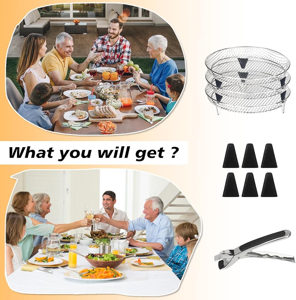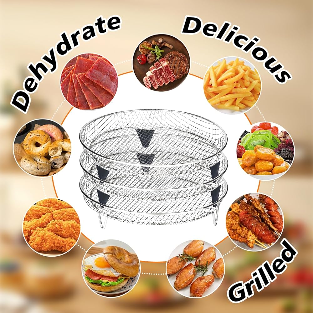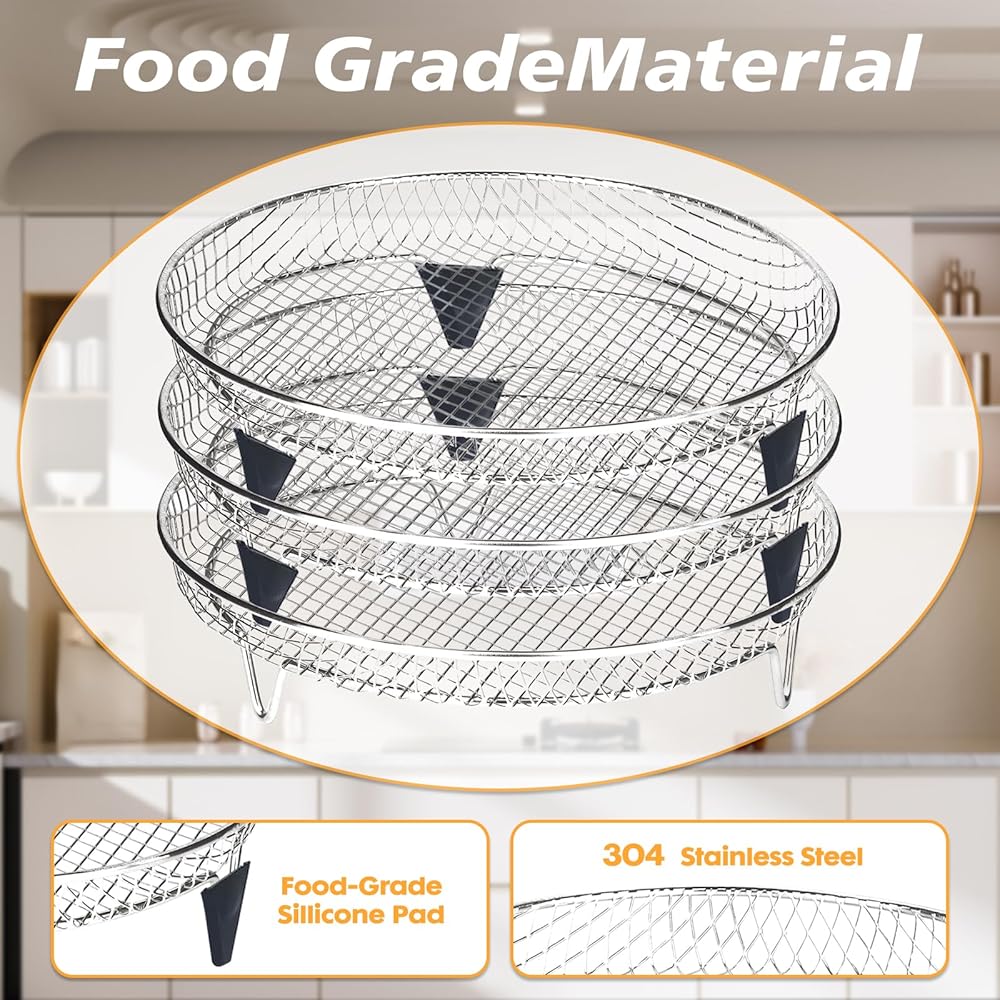 【Save your time & More food at one time】3 layers stackable airfryer basket stand, at the same time newly upgraded taller legs increase the height at which food can be placed, while ensuring that each level receives plenty of grilling; Quickly cook delicious food for whole family