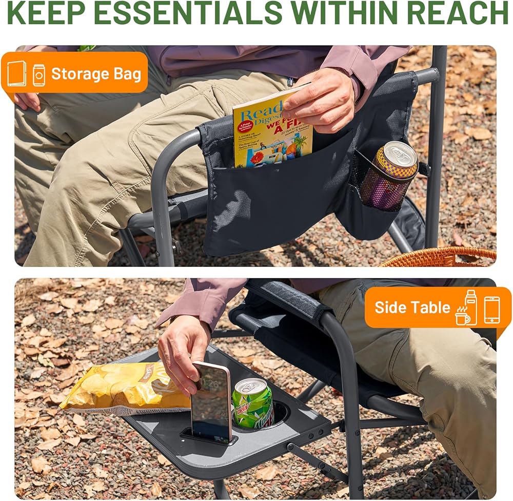MULTI-FUNCTIONAL SIDE TABLE AND POCKET: This big camping chair comes with a side table that can hold water bottles, food, and books, all within easy reach. The detachable large side pocket on the other armrest offers storage space for keeping items.