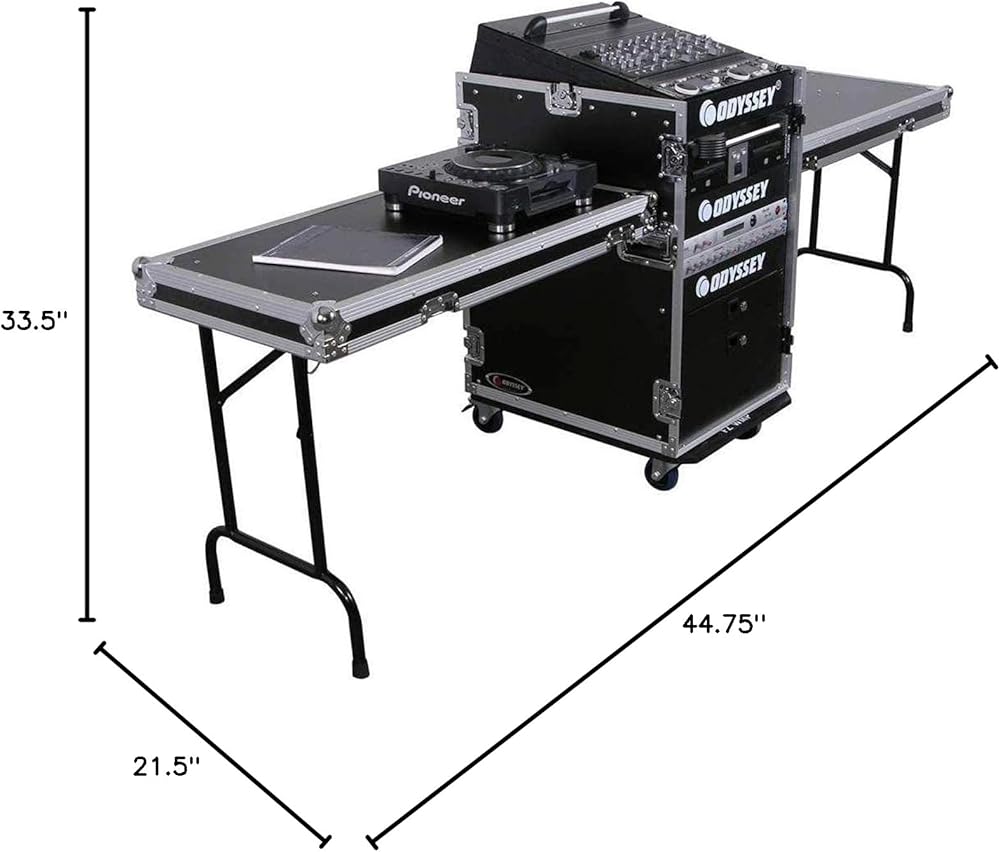Our Combo Racks give you the best of both worlds. Mount mixers and controllers on top for convenient access and all other essentials below. Each features heavy-duty rubber feet (non-wheeled versions), spring-loaded handles, and recessed hardware. "W" versions feature heavy-duty casters on a dolly plate (2 with sure stop brakes) while "DLX" versions feature lids that double as side mount workstation tables.Features and Specifications 3/8" Ply Construction Top Slanted Rack: 13 spaces Bottom Vertical Rack: 16 spaces Heavy-Duty Ball Corners Recessed Latches and Spring-Loaded Handles 4" Heavy-Duty Casters(2 w/brakes)*Caster Assembly is Required Removable Front and Rear Lids Lids Convert Into Side Table Workstations Tables May Be Mounted on Either Side (*Weight Capacity: 200 lbs. Evenly Distributed) Table Height is 28.75" Rail to Rail Depth is 23.75" 3" Interior Depth at the Front from Top Slant Rail to Bottom Rail*** Props used in the product pictures or the interior of the soft cases/bags such as DJ controller, DJ mixer, different parts of the DJ podium, mixing console, accessories, speaker, TV monitor, cable, laptop, computer, microphone, headphones, sneeze guard, slipmat, turntable, turntable needle, etc are not included with the product. ***,Approx. Overall Product Dimensions (Edge to Edge): 21.5" W x 33.5" D x 44.75" H, Vertical Rack Spaces: 16, Slanted Rack Spaces: 13,