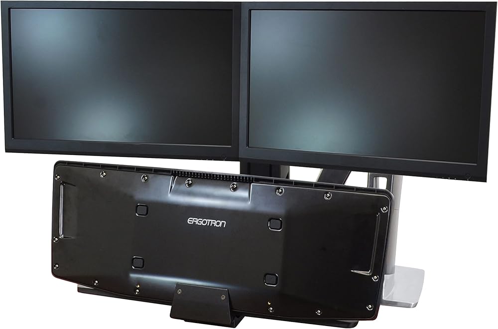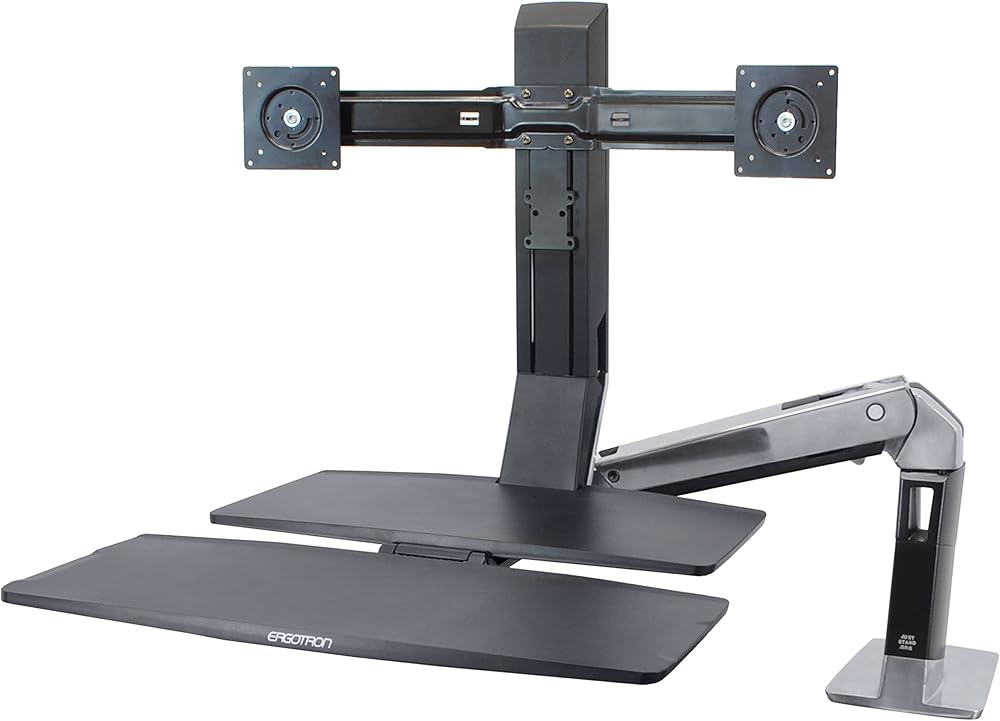 Swing for the fences with the ultra-movable WorkFit-A with Suspended Keyboard. The arm-based design lets you swing your full standing workstation left, right, up or down to sit or stand while you work. One easy movement using Constant Force technology adjusts the complete workstation through the full 20"" (51 cm) lift range. Fine-tune your monitors with an extra 5"" (13 cm) of independent adjustment. The keyboard and mouse sit below the desktop for an ergonomics home run when sitting. Need extra space? Just fold the keyboard up and push the arm out of the way. · Versatile fit: Designed to accommodate a wide range of users with a 20-inch (51-centimeter) lift range · Personalized view: Offers an extra 5 inches (13 centimeters) of independent monitor height adjustment · Quick collaboration: Flexible arm design makes screen-sharing easy for group work · Extra workspace: Complimentary worksurface keeps your tablet, smartphone or notes nearby · Stay organized: Cable management controls the cable chaos for a neat workspace · Flexible installation: Choose between multiple install options to best fit your space Our professional-grade products undergo rigorous motion tests so you can enjoy trouble-free adjustments for the long-haul. WorkFit-A is factory-tested to withstand up to 4 times its weight capacity, so you don't have to worry about sag or height-drop as you work. Plus, WorkFit-A is certified in compliance with ANSI/BIFMA indoor air quality standards for VOC emissions. Available in Polished Aluminum.