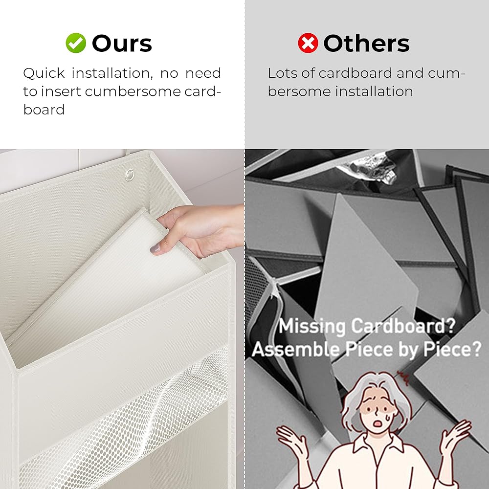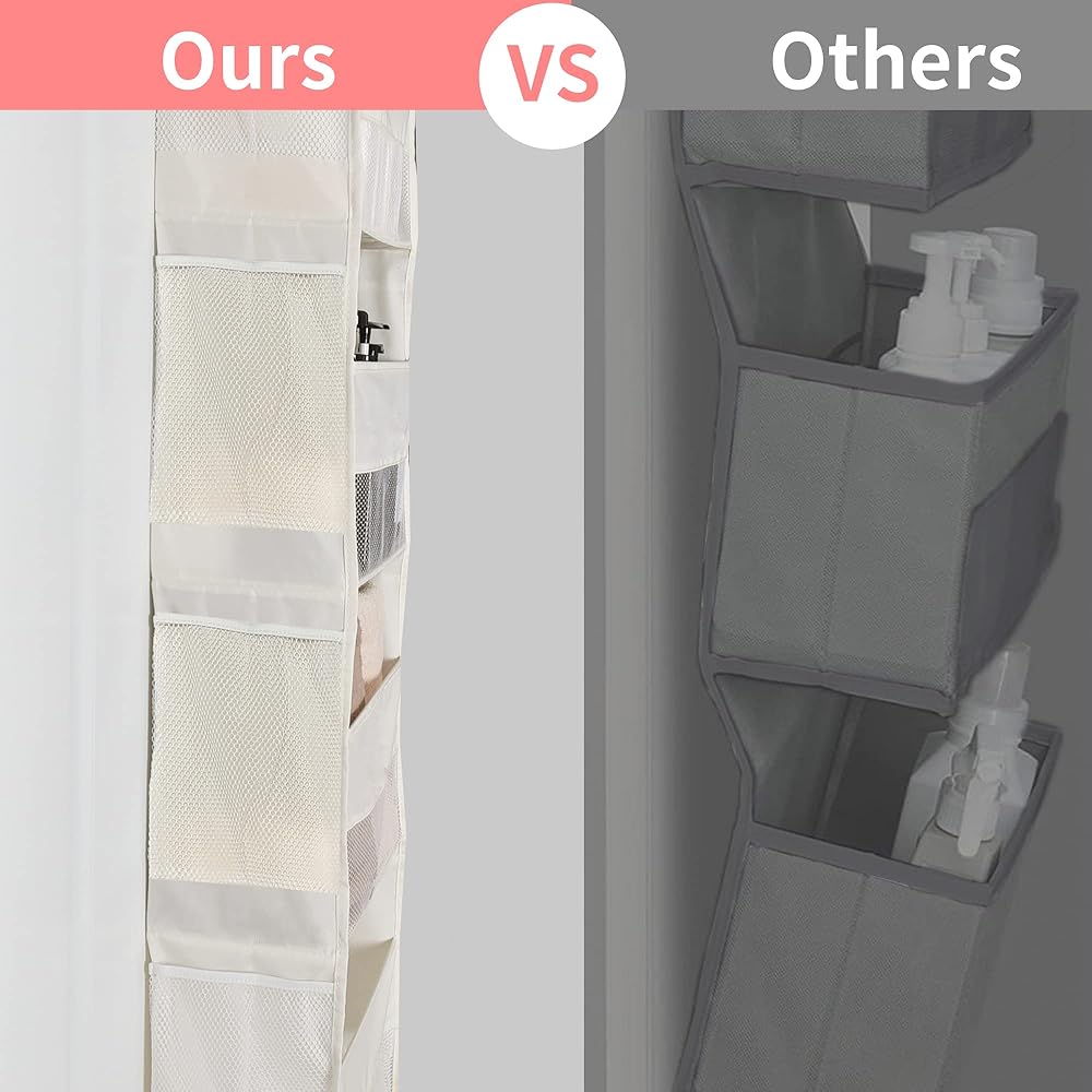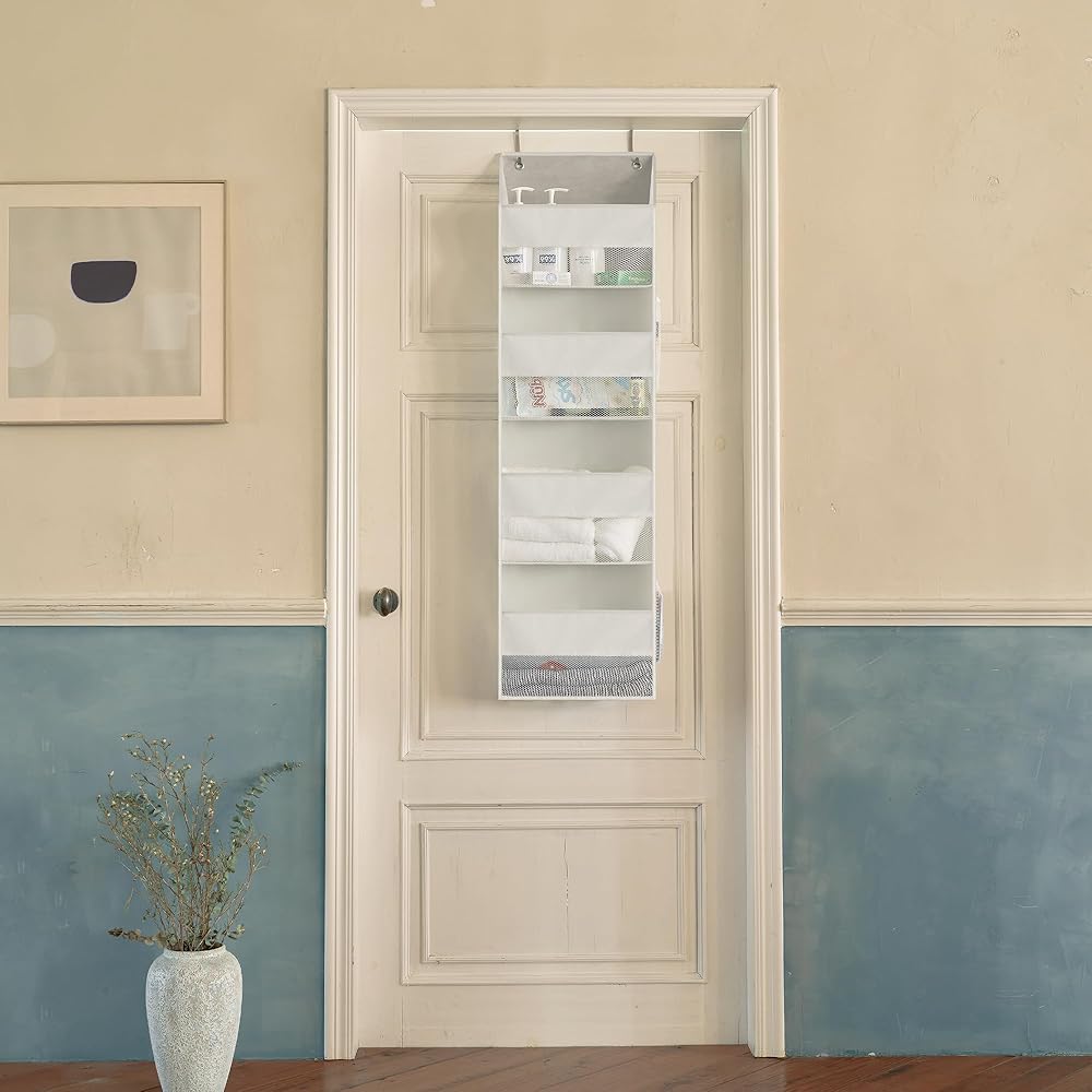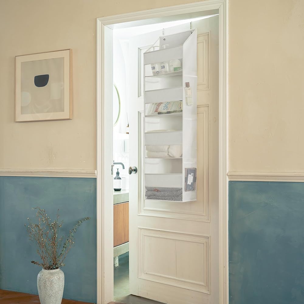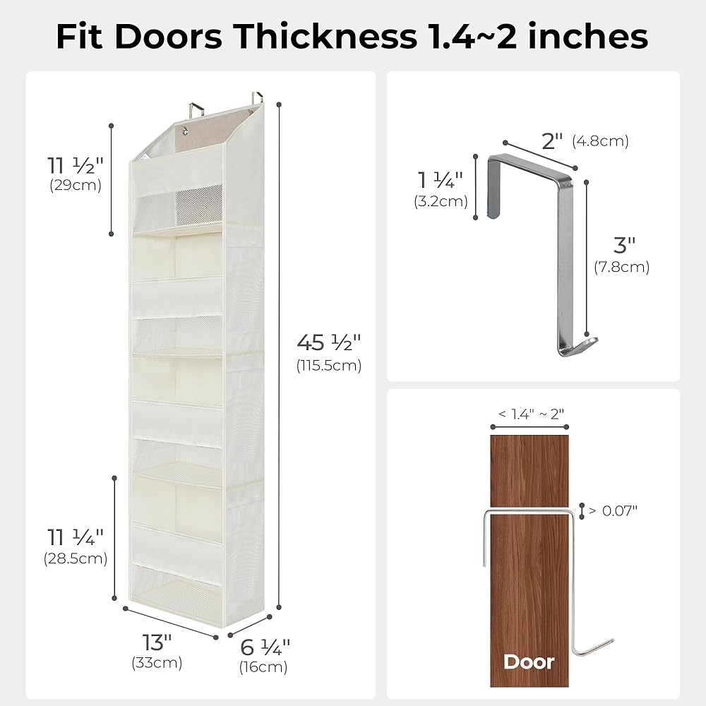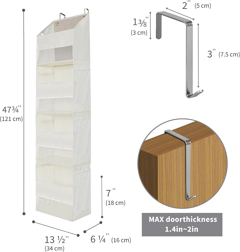 Large Capacity - Our over the door organizer is made of moisture-proof, breathable, odorless, durable polyester fabric. The wall cabinet behind the door measures 13 ½''L x 6 ¼''W x 47 ¾''H. The capacity is enough to hold many items of different sizes, and you can easily put in and take out the items you need. The product is light and easy to assemble.